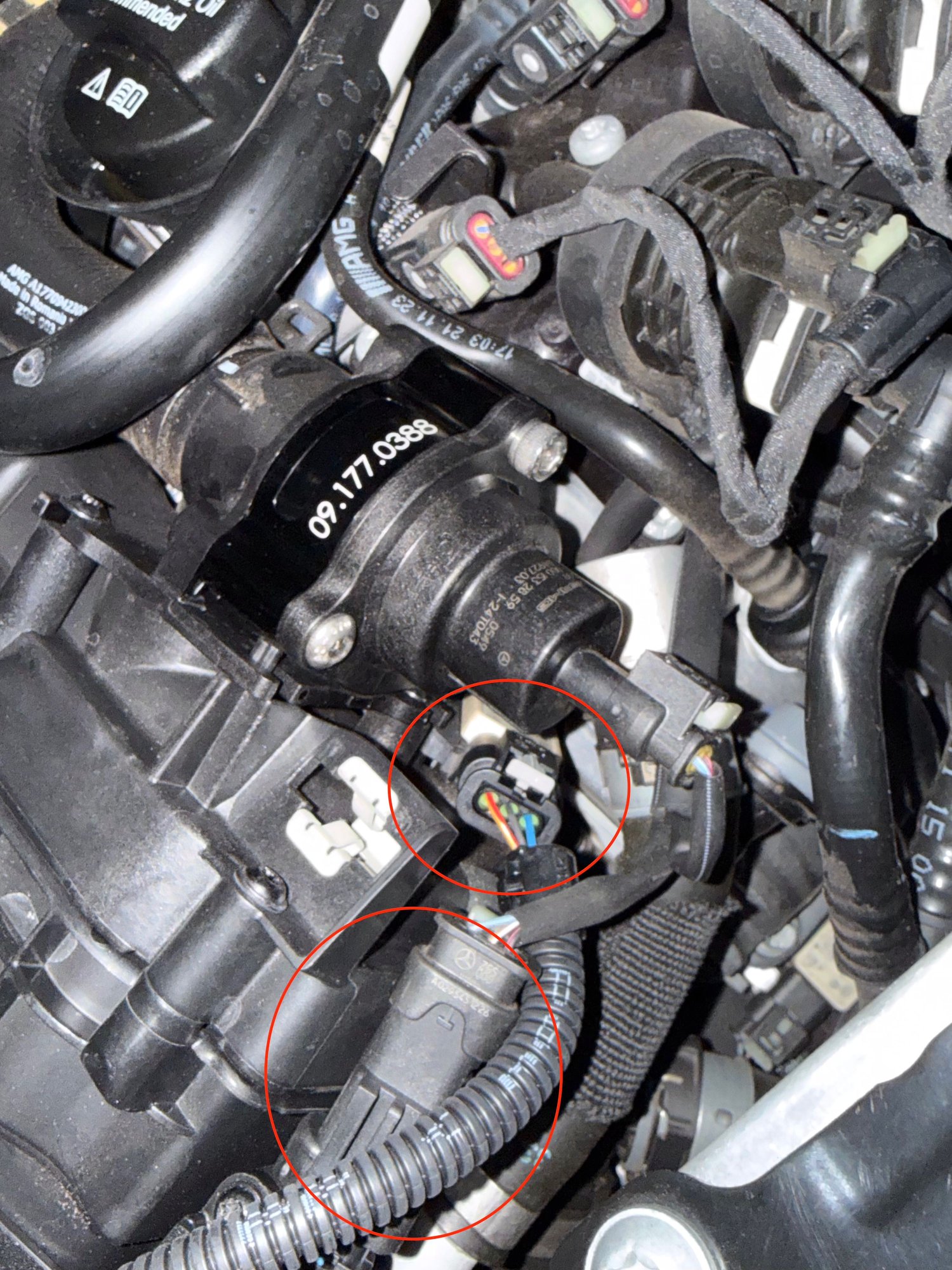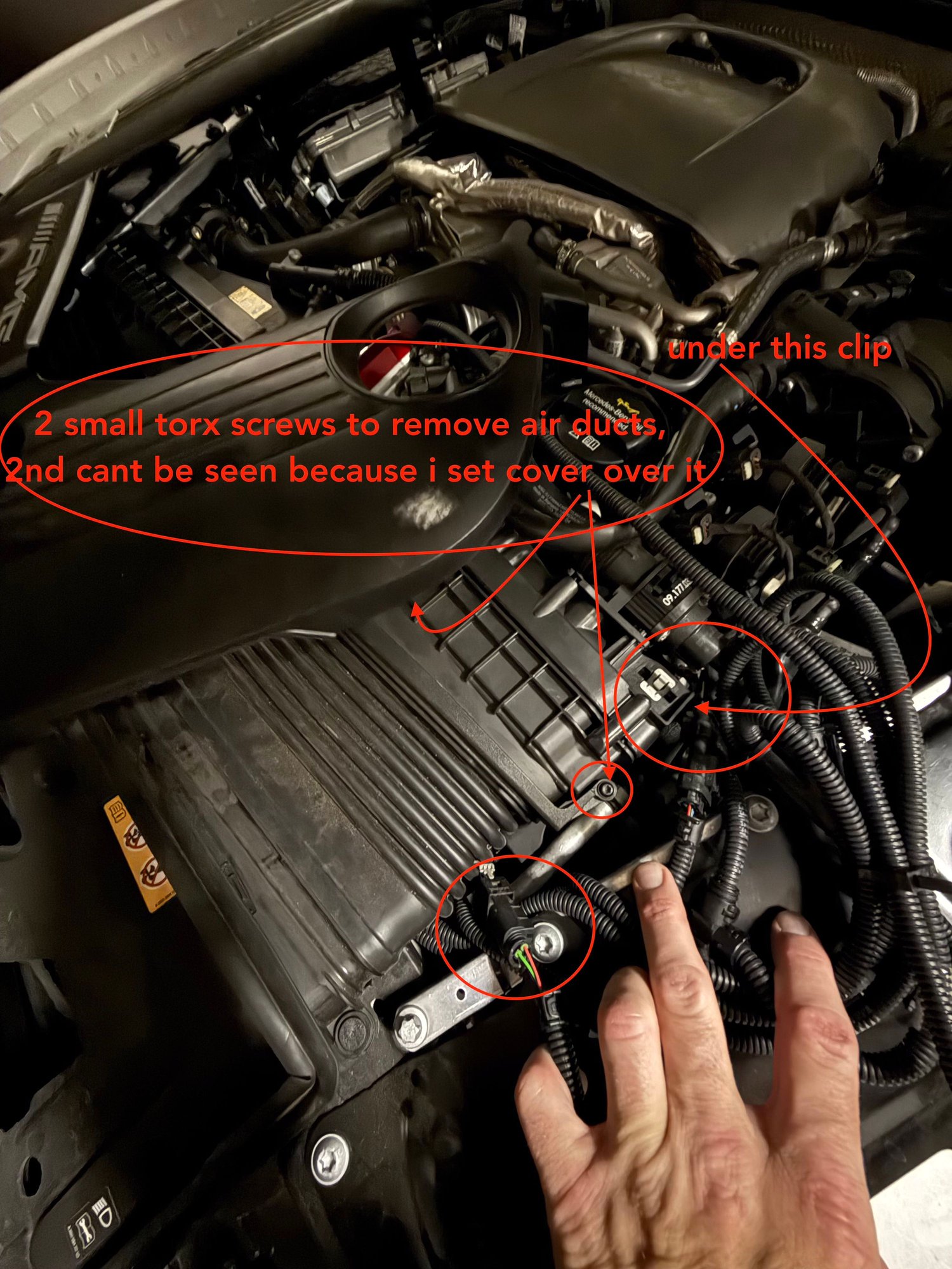 There is 2 small Torx screws to remove the air duct out of the way. This will allow you to see the sensor on the charge cooler. The other one on the airbox I had to look for a little but found it right on top outside corner/back of the airbox/filter housing. tried my best to circle them. but you just unplug the sensors, then plug in the matching renntech plug the male renntech side into the female AMG side, then the other renntech plug thats female into the male end of the AMG side.