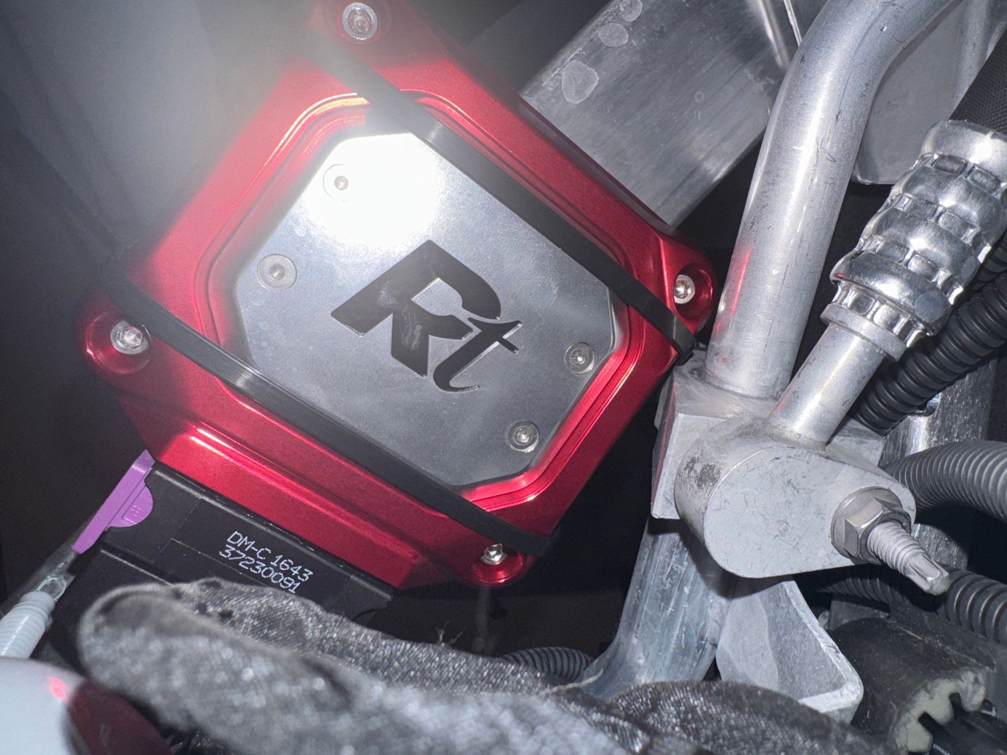 As for the where I placed the RPM unit.... I temporarily set it kind of between the 2 air boxes, under the engine cover. I loosely zip tied it to a couple of points I could reach, but im not overly happy with it there, you can kind of see it peaking under the oil cap hole in the engine cover. again, not ideal, but it was getting dark out, so I temporarily set it there and seemed to be decently secure with a couple zip ties, just not pretty. It's the little red/silver looking box you can see in where the oil cap goes.