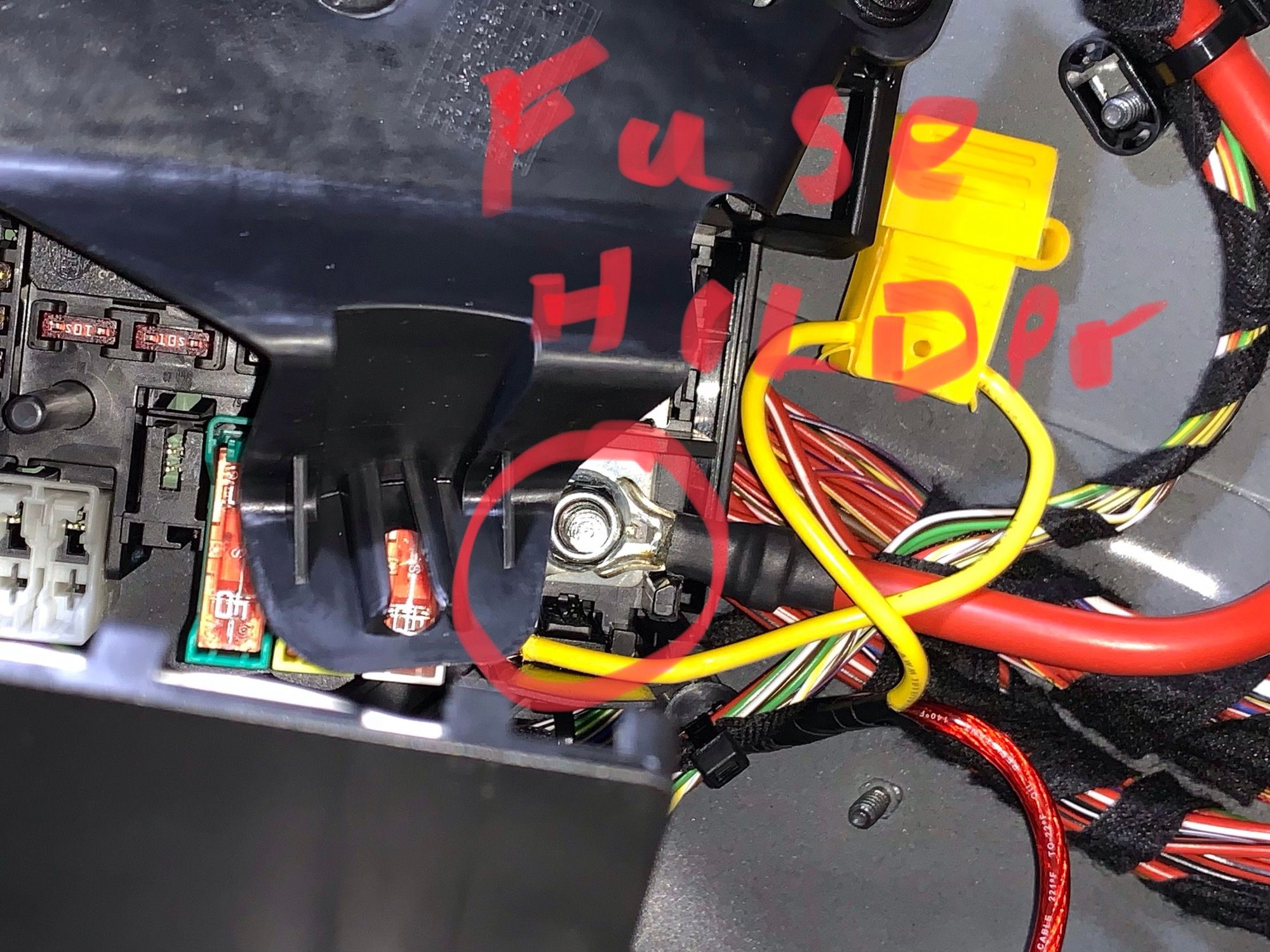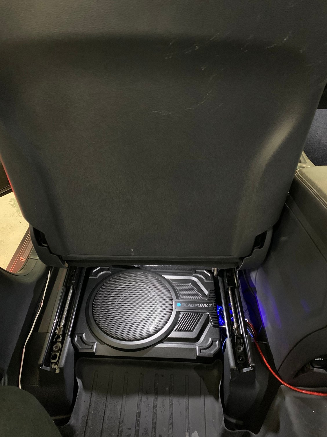 Hi all, I received my Blaupunkt GTHS131 compact subwoofer. I’m very satisfied of the build quality and the bass is awesome. I did my installation installation my self in my garage after reading and finding all,information on my others web site. The hardest part was to find out where to find out original speakers wires for the high input into the sub amp. Finally I found speaker wires was on both side of the front side foot panel, it was quite easy to remove the plastic with my hand and two connectors was attached I just pulled them to see which one was for the speakers until the sound stop when I disconnected the plug. 4 wires was on this connector two was already twisted together and two others was for a bit bigger in size and notice was for the light door panel. I split Y with this speaker wire and route them thru my under Seat. Next step was to find out power near by and hopefully cigarette lighter was easy to access from the rear seat just pull out this panel and split Y here for my Amp remote on under my seat, I attached also I ground wire right there from the bolt who hold the center console, I just unscrew them tap a huge ground wire to amp. Now the only thing left was to route a positive wire to 12v fuse boxe just under the passenger seat, I pull the carpet and find out a huge red wire who came from the battery directly, this was bigger than expect for my 150w amp sub... why not !! Just attached a fuse holder unscrew the bolt a bit and bingo. I route all wires into the central console, except the speaker input on the side. The amp,fit perfectly under my seat I removed the plastic vent for back feet heating, «no one seat under me anyway », and the amp will be a good source of heat