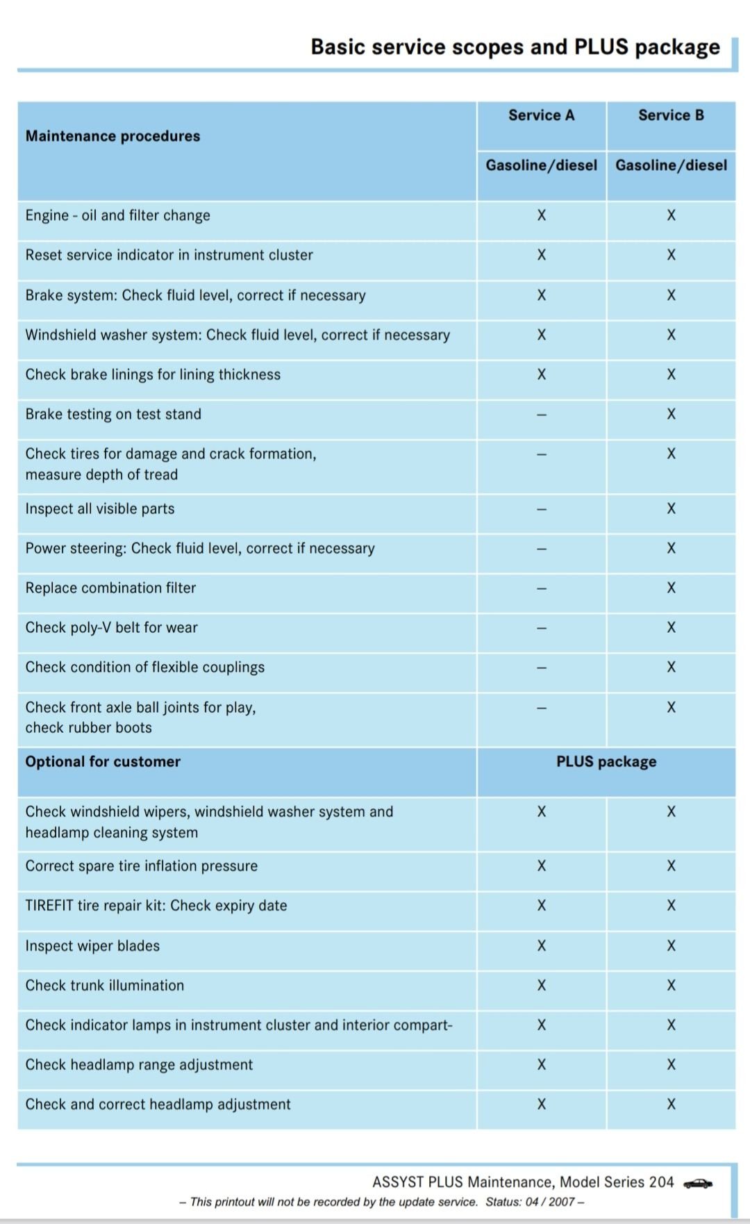 I recently purchased an 08 C300 4Matic sport, and the A3 service is coming up within the next 15 days. I have done a little bit of research, and it seems that the B service's entail the major maintenance. But i am not seeing much on what exactly the A3 service includes. Have any of your recently had this service performed and recall what was completed, or what i should be expecting?
