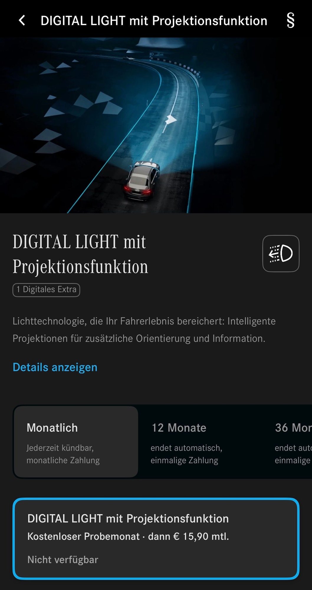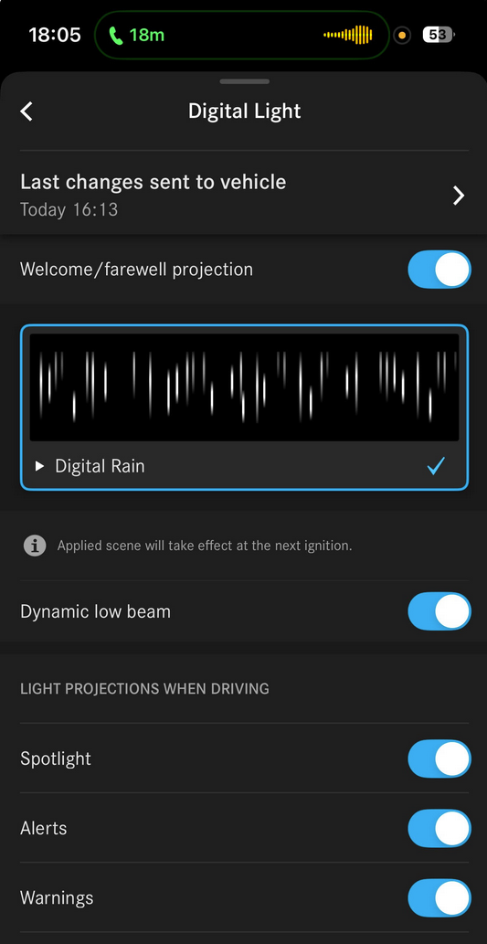 Furthermore, even in my Mercedes Me app (see screenshot) it says that upon start I should be able to see/choose a "Digital Rain" animation, but this is not the case and the animation upon start is just some lights crossing each other, however with my specs and model, this should be available and also it shows on the video that this is a feature of Digital Lights (see video link