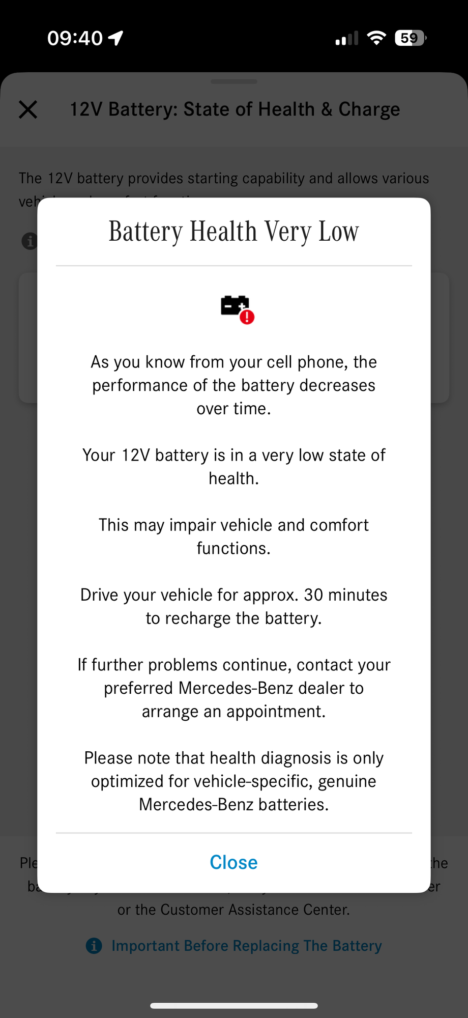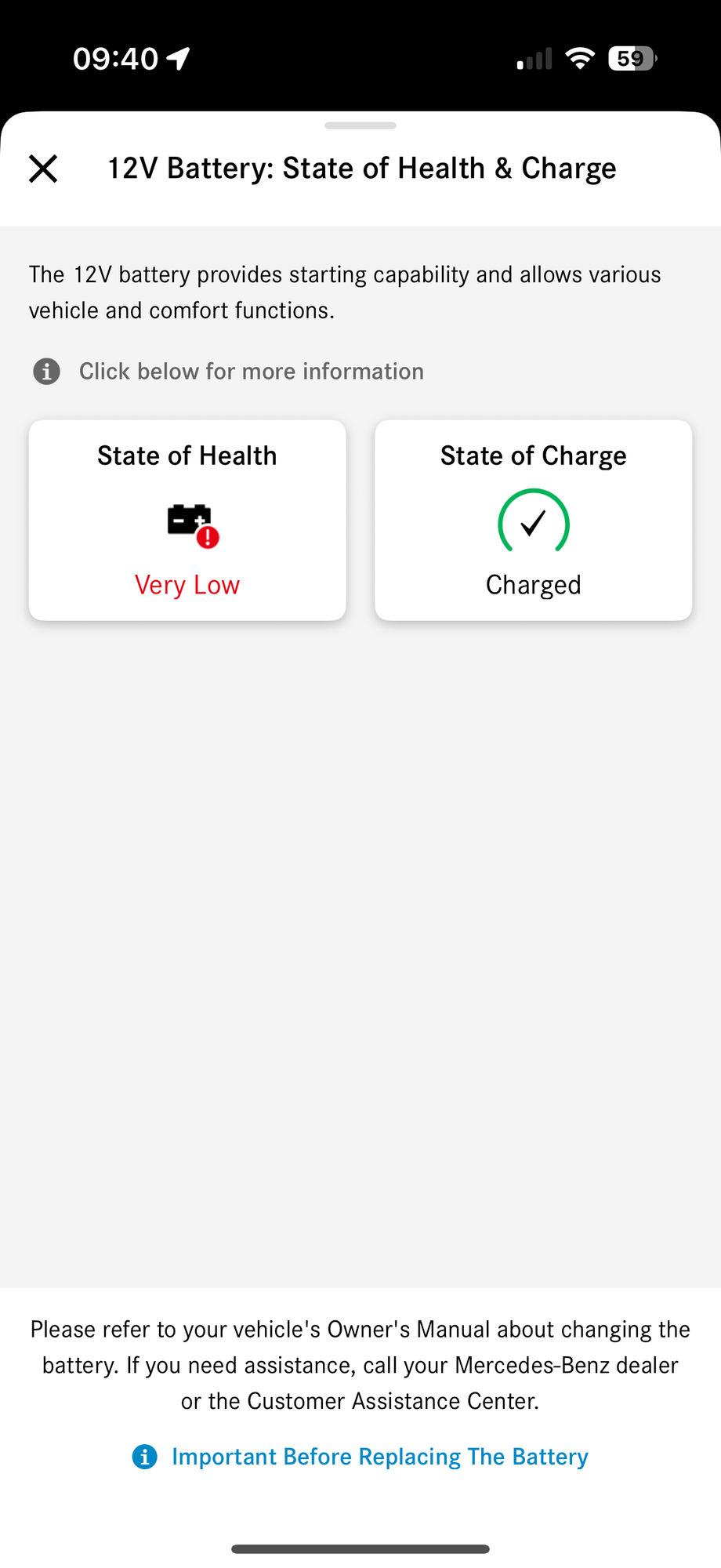 I didn't encounter any problems up to the end of December 2024. As I use the car only for long distances, and not for driving around through the city because the size is not convenient, normally I travel about 300 km per week, these in a day or two. Then the car remains parked in a closed garage for about 6 to 7 days. At the end of December 2024, I received a message in the Mercedes app that the 12 V battery was low. This was the first time, the months before that the menu shown the battery fully charged even when I was abroad and the car was left for more than two weeks without driving it.