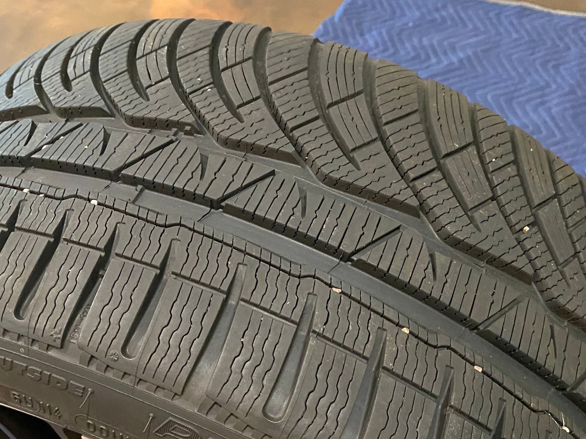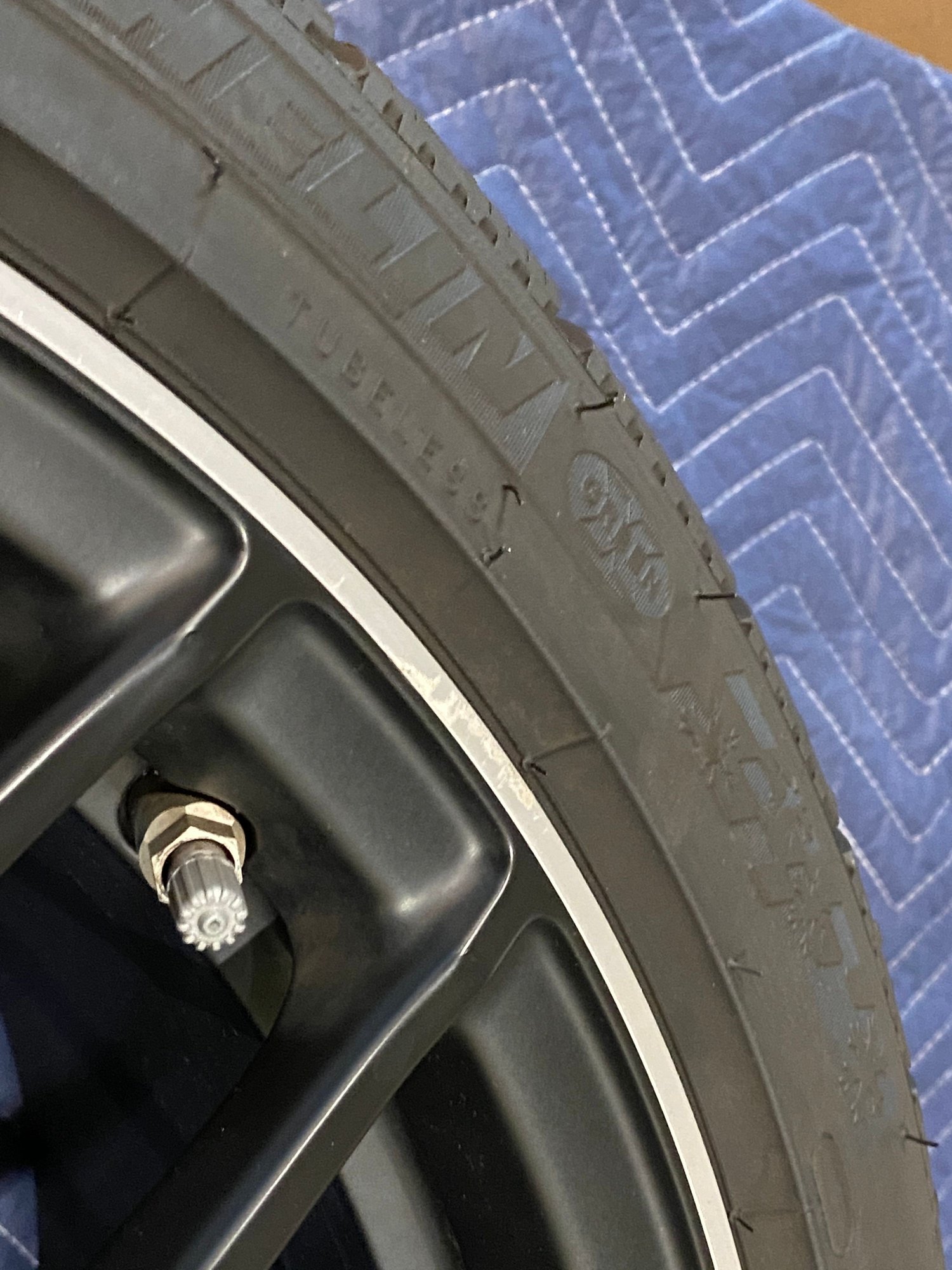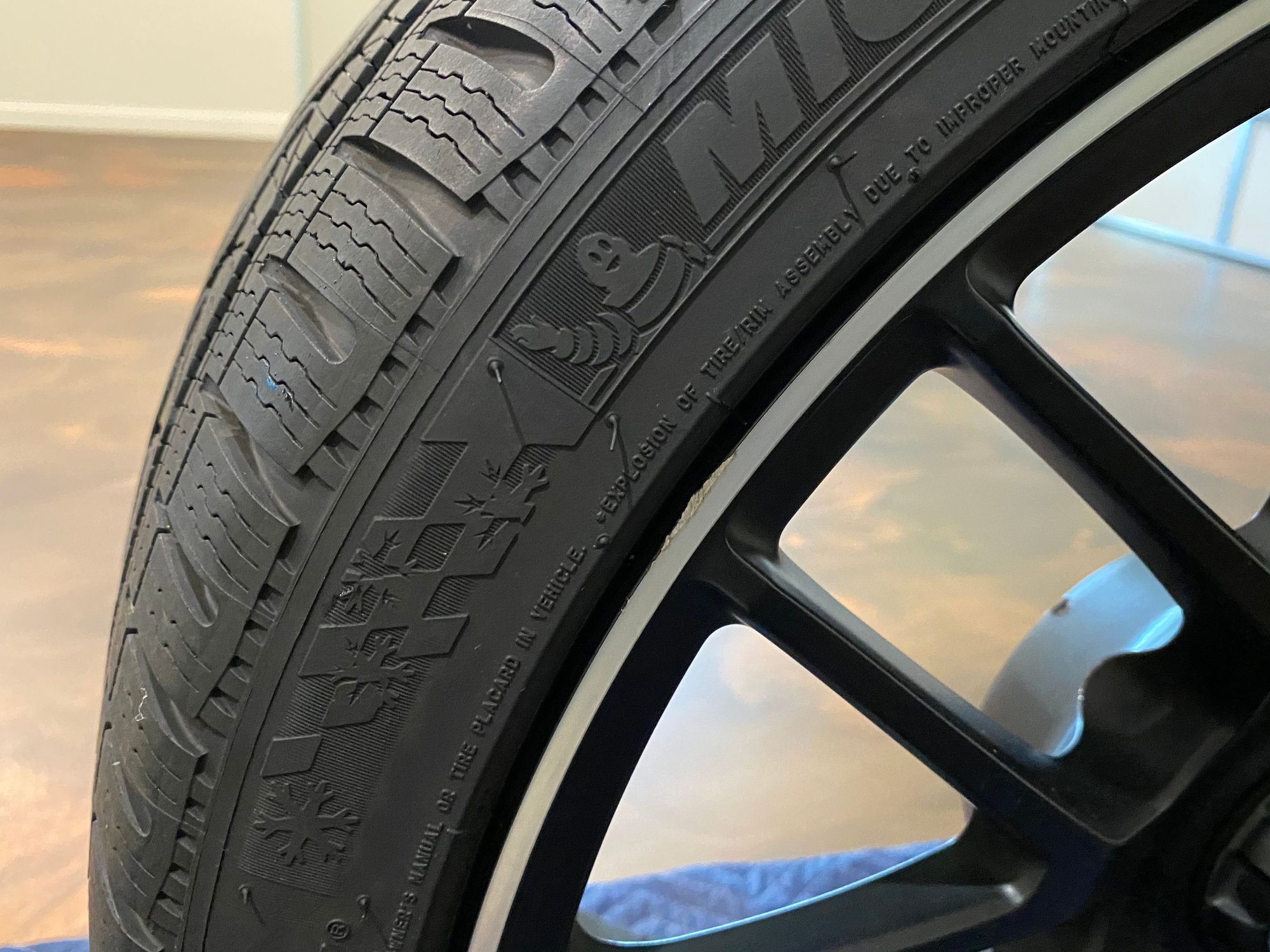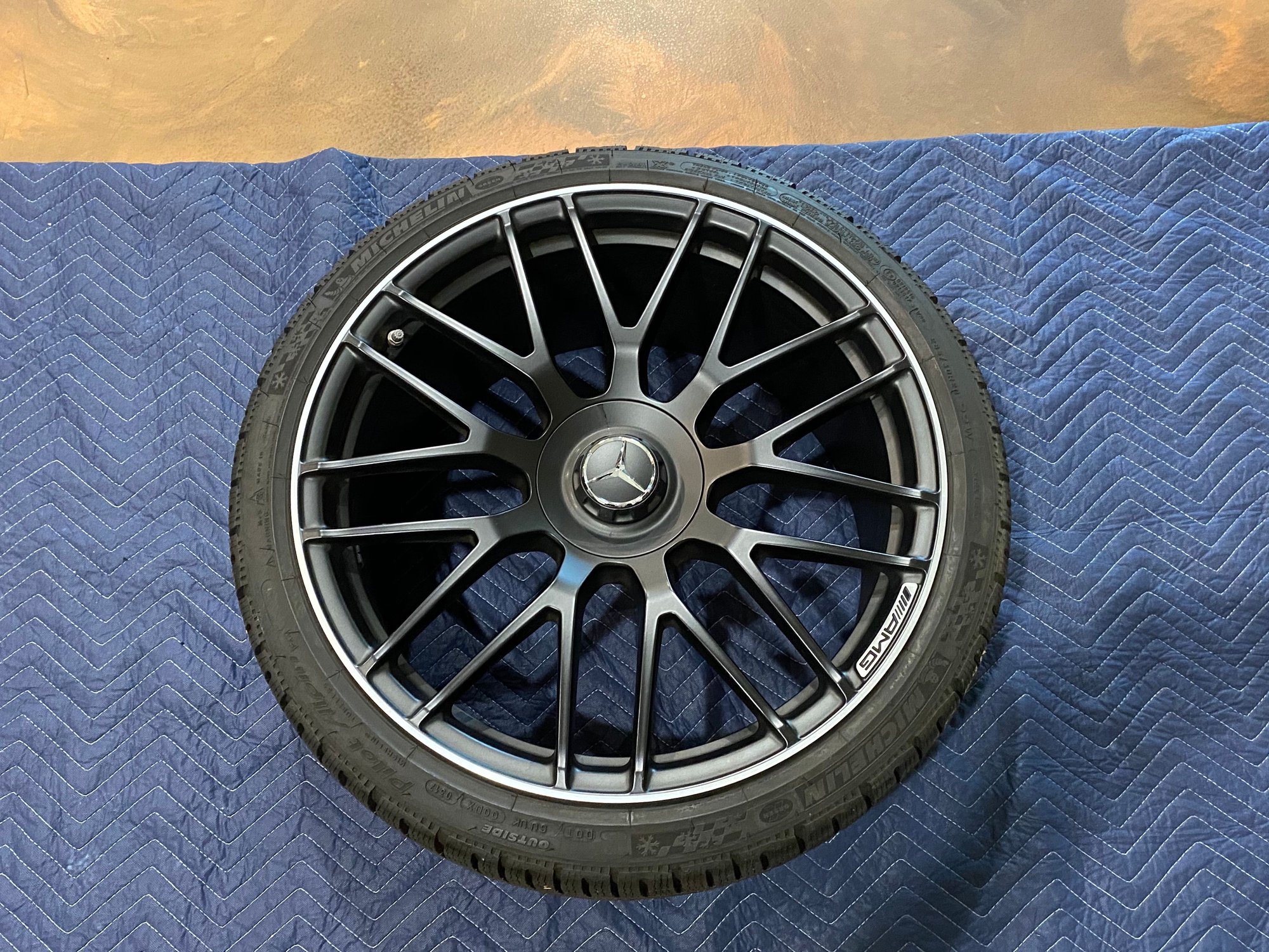 Original, OEM Black Spoke AMG Wheels from a 2017 AMG C63S Coupe mounted with Michelin PA4 winter tires. Tires are matching OEM spec sizes. Tires have one winter approximately 3-4K miles (at most) - and probably less as they were used for simply driving back/forth to work while working up in Minnesota. These tires got me through 10+ inches of snow storms and have amazing traction/control. (You can see reviews for the Michelin PA4 on several sites - tirerack, discount, etc.)