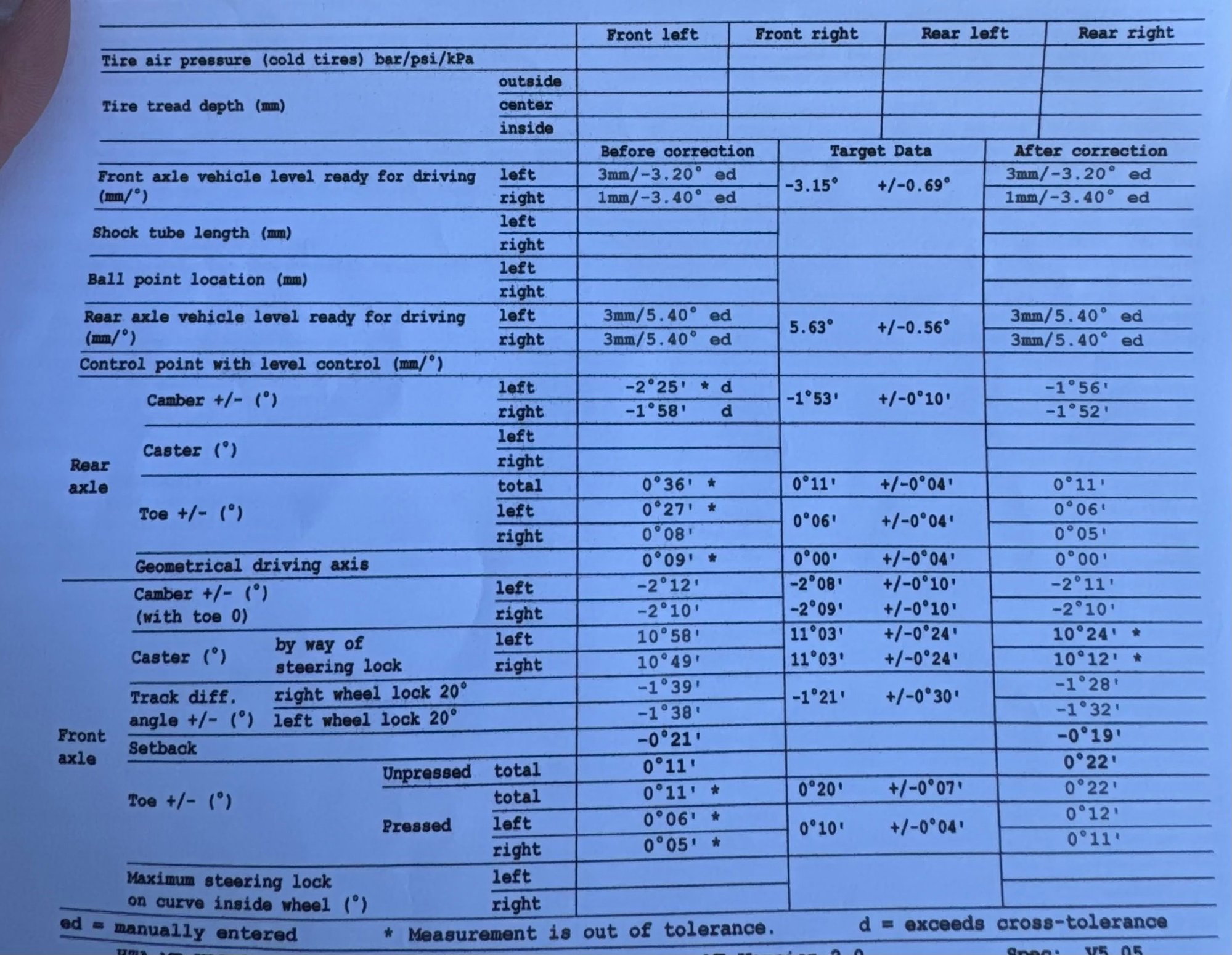 clean carfax, PPI came back clean, no damaged to the suspension components at least visibly, everything lines up. The previous values weren’t THAT bad I don’t think. Do you see anything wildly out of spec? Not really sure how how these things are supposed to be
