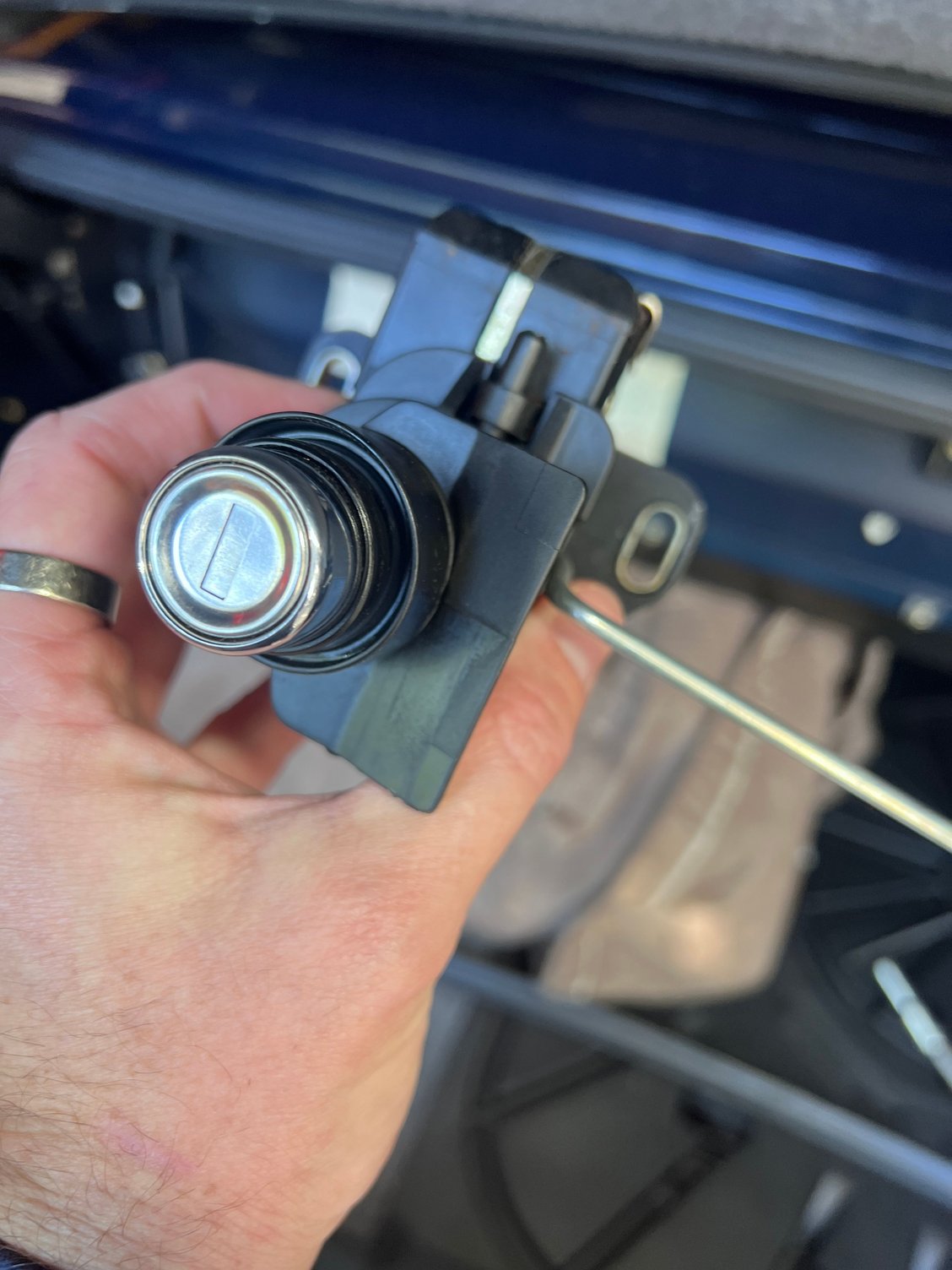 I'm trying to get this trunk lock cylinder out of the trunk latch (but don't have the key) 1994 date code on trunk latch. Still works perfectly. Ugh corrosion. Luckily caught it in time. Not rusted at all on the underside of the metal here, so ... yeah. Fixing that up -- grinding down, painting with rust paint (Eastwood or POR type, will topcoat with midnight blue sprayed on to look decent -- all covered by the black plastic trunk interior trim panel so not visible...)