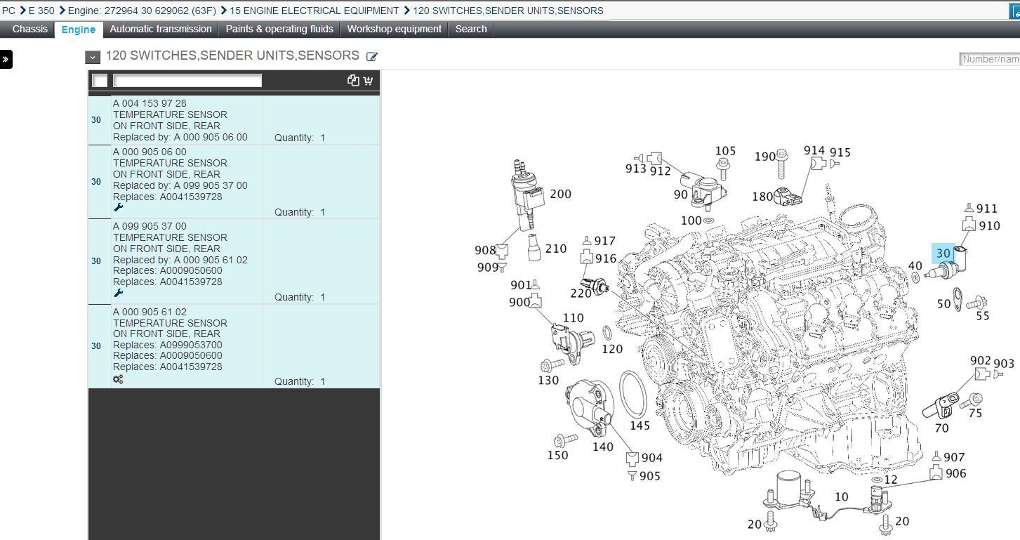 Looks like coolant temp sensor 0009056102, sealing ring (40 in diagram) is available separately 0229979848. Attachment inclusive of all part #s is for future reference.