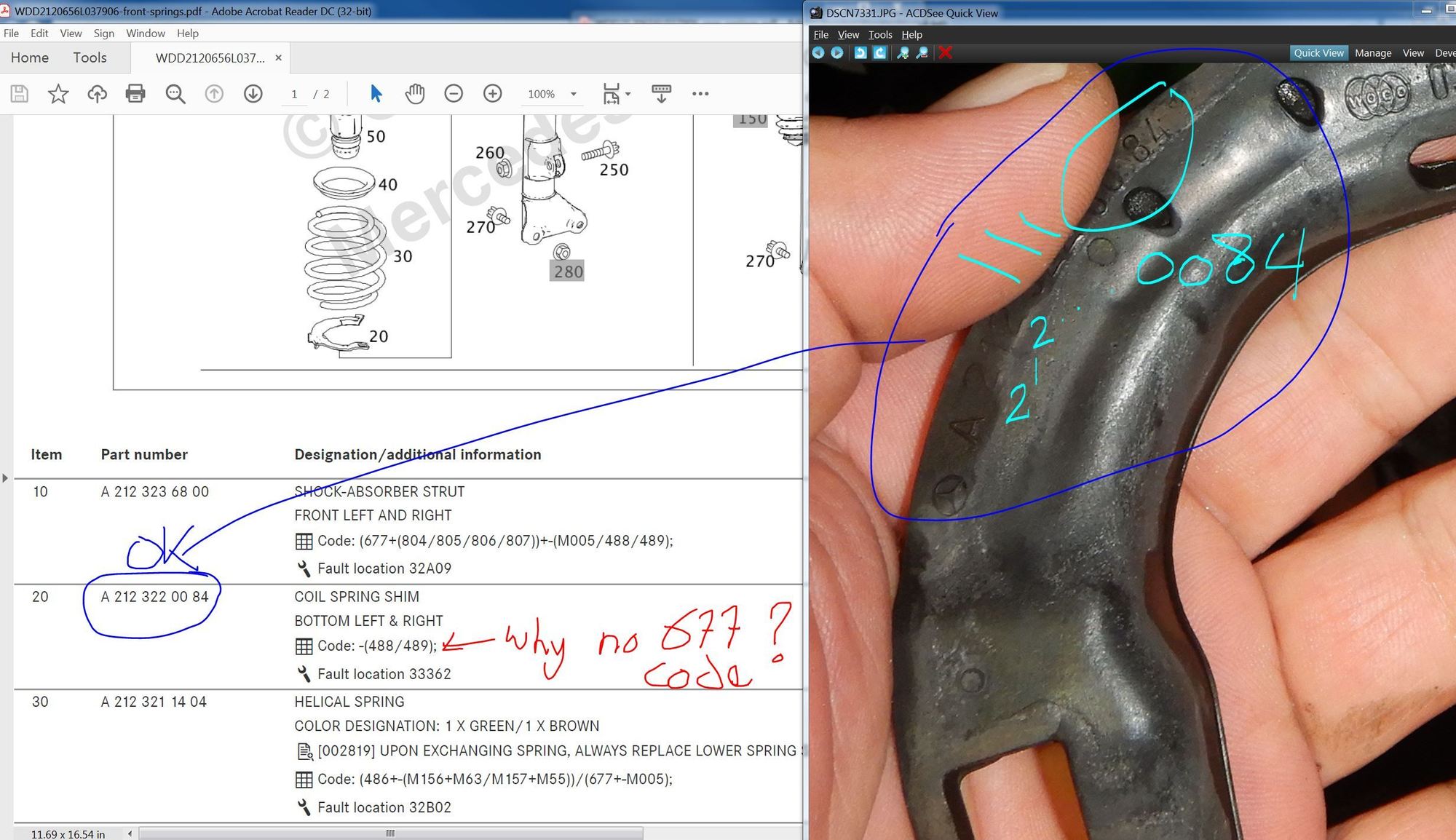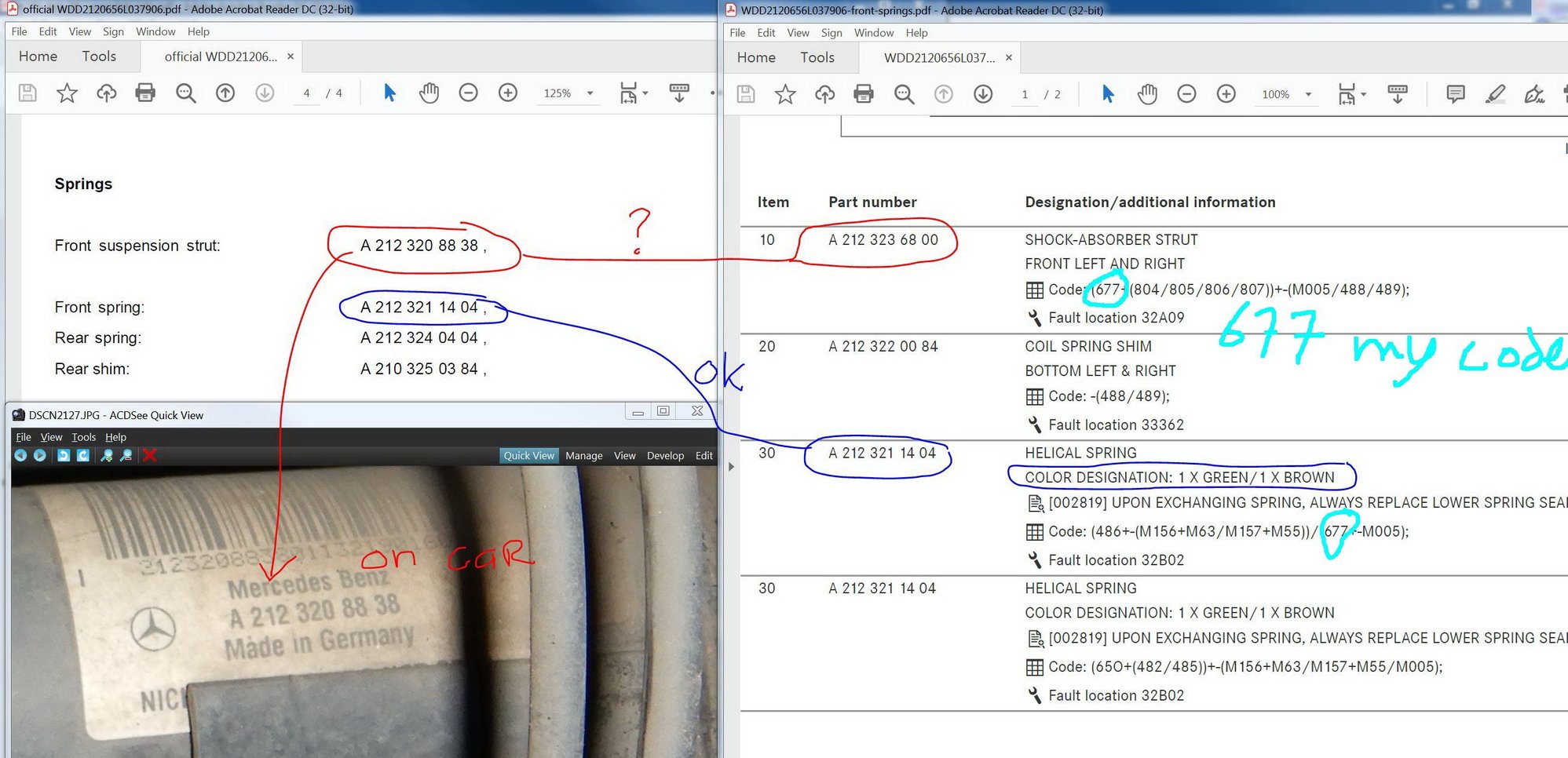 i haven't looked specifically at w212 springs, but on a w124, there were at least 3 different suspension options, (high clearance for countries with rough roads, sportline, regular), then for each option, there were 2-3 different front springs, and a dozen different thickness spring pads, and a table in the parts catalog where you add points for each option you have, starting with a baseline for the engine and chassis version you have, and the resulting score was looked up in a table, which would tell you what spring, and which spacer pad. same thjing for the rear springs, but the option points were different (some options put more weight in front, others in the middle, and others in the rear).