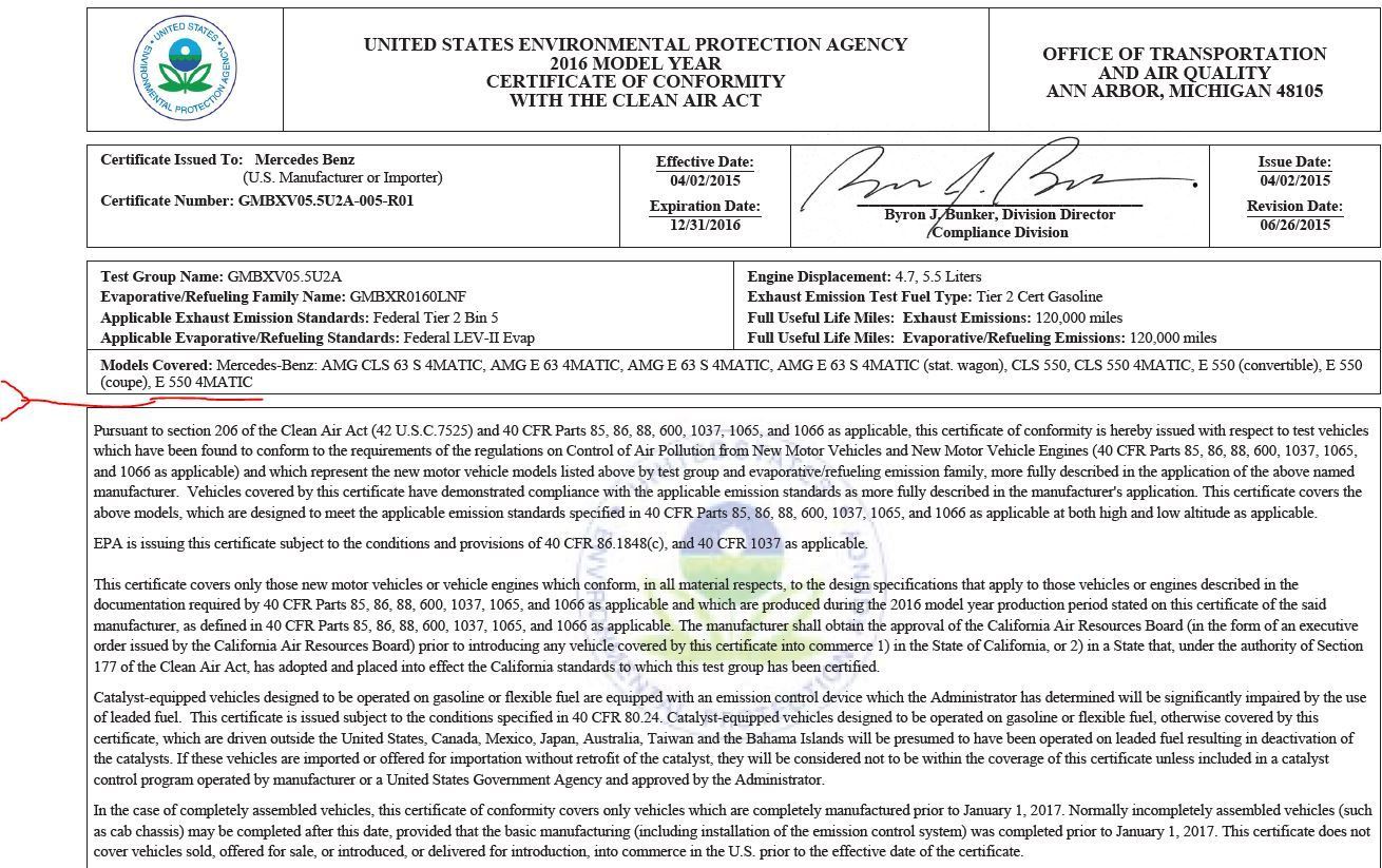 For clarification, I have no intention to buy an MB from Canada (at the moment); however, here is some information about EPA regarding the 2016 E550.