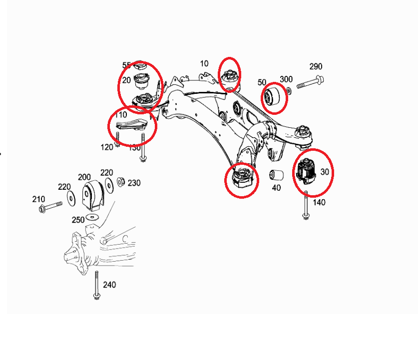In the photos above where someone had the subframe replaced under warranty it looks like all the bolts and bushings are new. Thinking about it all the bolts should be replaced with new at least, im even guessing the bushings should be new also. I cant see pressing the old bushings out to install in a new frame being legit. And in my MB manual is says to replace all the bolts when performing the work.