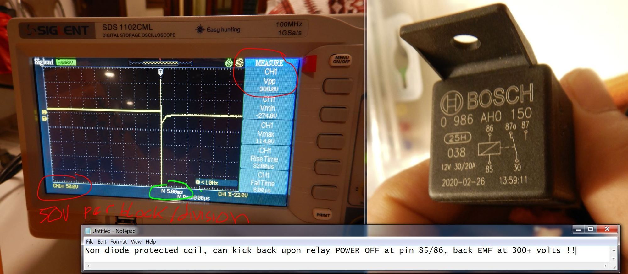 This is a spike of a a regular relay without resistor at the coil 85/86 ( pin 1 and pin 2 ), yep 388 volts