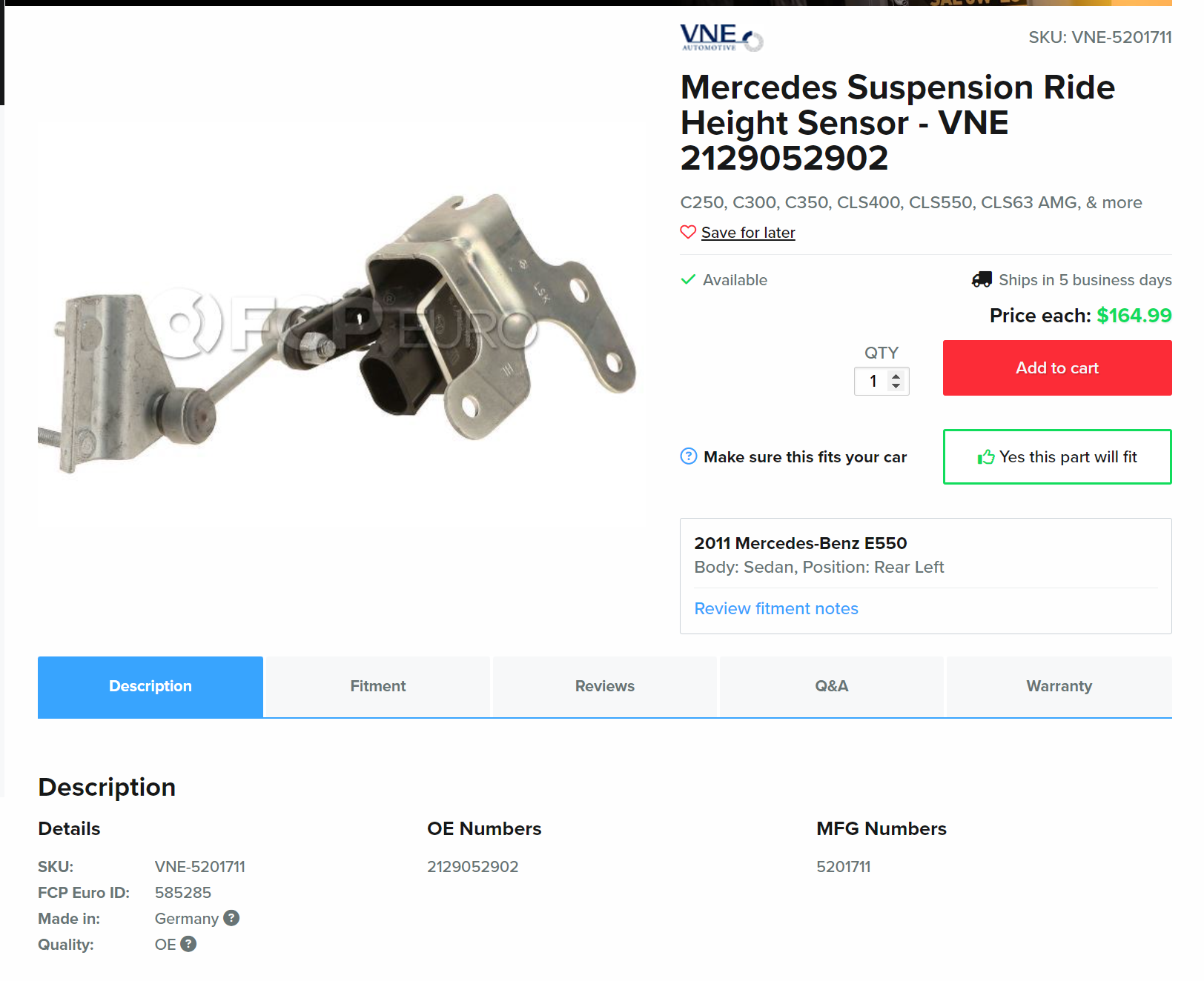 I took my car in because my rear subframe was cracked and they came back with a handful of other issues back there, including the rear height level sensors being seized. My first thought was to try to spray some penetrating oil on the linkage to see if that frees it up, but assuming it doesn't, does anyone have the part number for these? I wasn't having much luck searching on this. The dealer wants $887.84 to replace them.