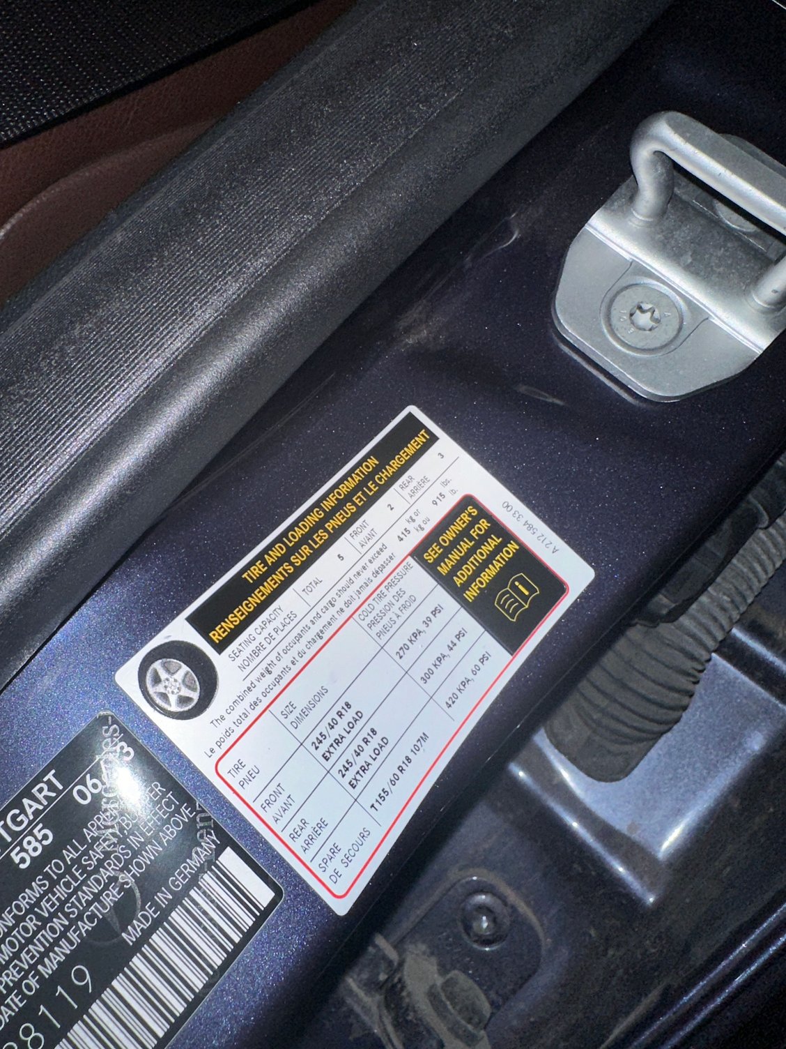 I just repaired my front cracked rim. I think your sticker PSI listed is for 'heavy load' situations. I run MB 'normal' settings that are softer due to road conditions in my area. YMMV.