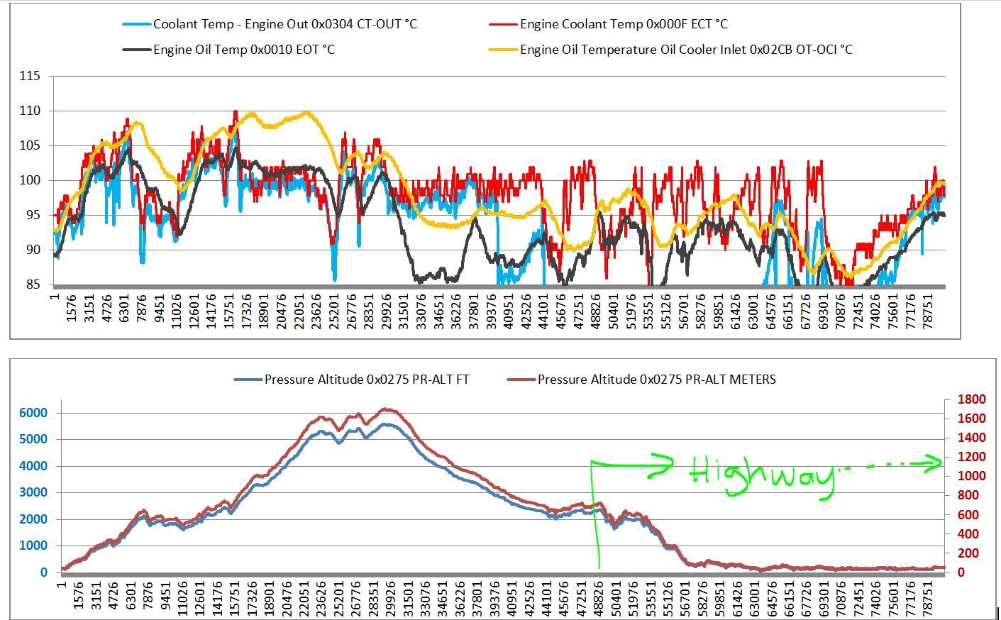Engine oil and coolant temp also stressed out. Engine Oil temp Oil Cooler Inlet in oil pan skin temperature, and is before the oil cooler Engine Oil Temp is oil pressure sensor skin temperature. The oil pressure sensor is at the designated oil pressure test port. Engine Coolant Temp is OE from the engine ECM, that is the coolant sensor located at Bank 2 most rear azz, near the outlet to heater core HVAC. This sensor is submerged in coolant. Engine Coolant Temp - Engine Out is coolant temp after it exit the turbocharger cooling gallery and is a coolant pipe skin temperature.