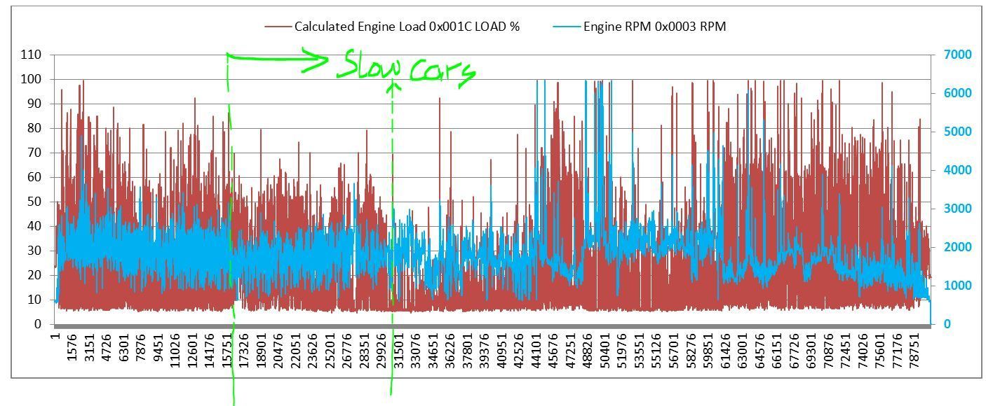 The engine load is not too bad and less when I had to be behind the 2 slow cars at data points 16,000 to about 30,000 ish, where the by data points 29,000 ish...it is going down the mountain, no more climbing.