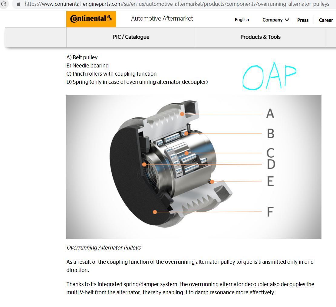 Pre 2014, these alternators had OAPs. They were designed with the same fuel efficiency standard in mind, reduced/eliminated drag during shifts and assisted with rapid RPM drops as well as having smoother operation to the motor. NVH and fuel benefits achieved.