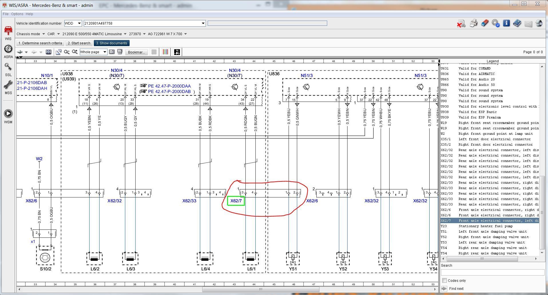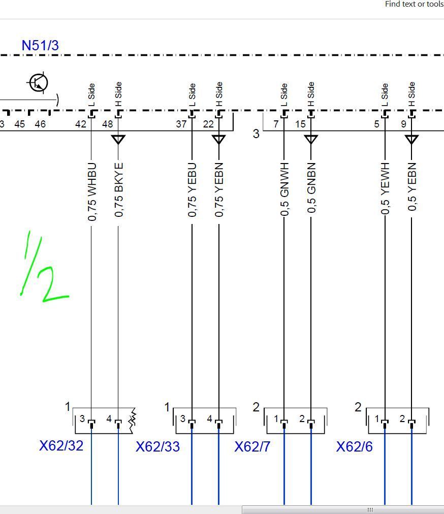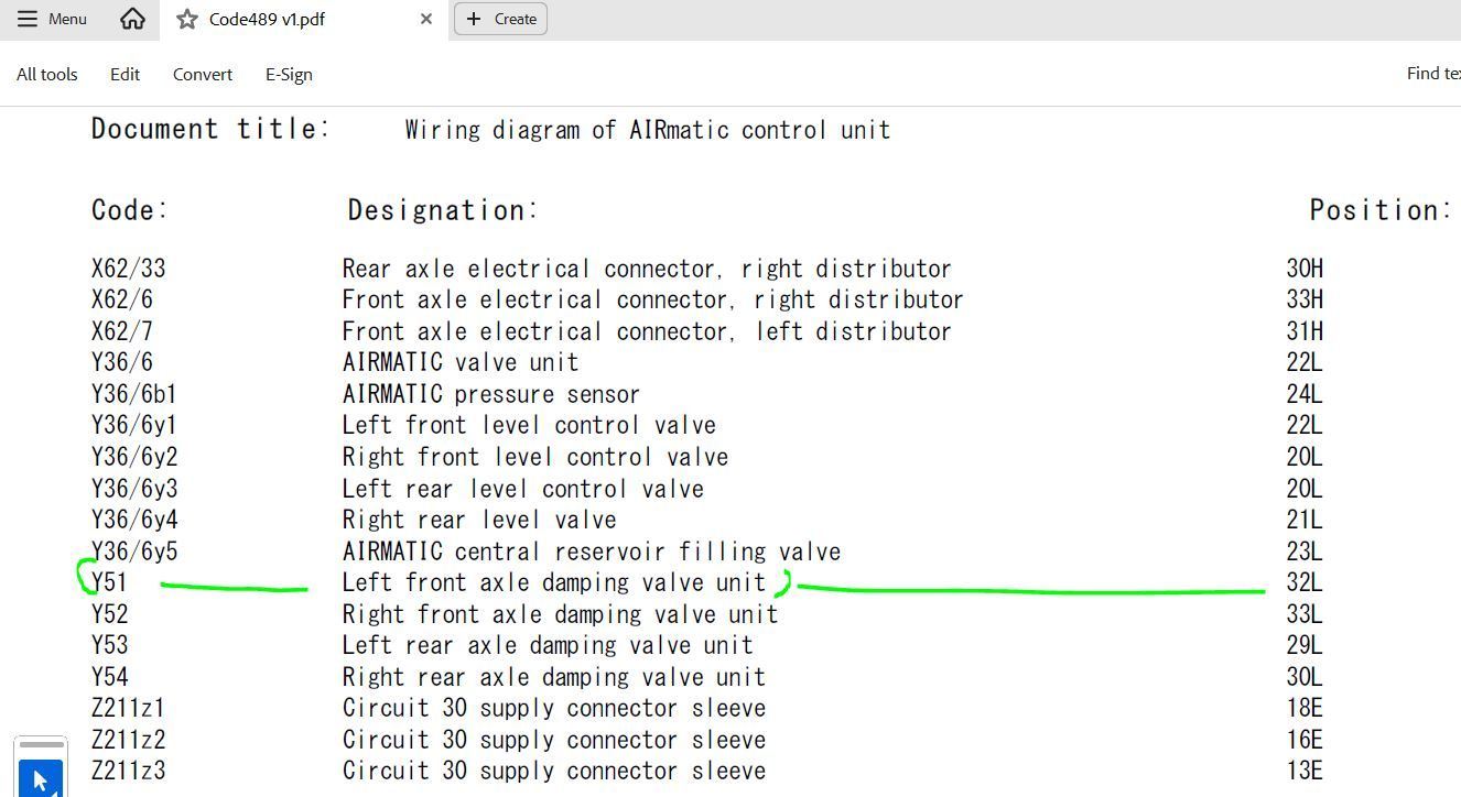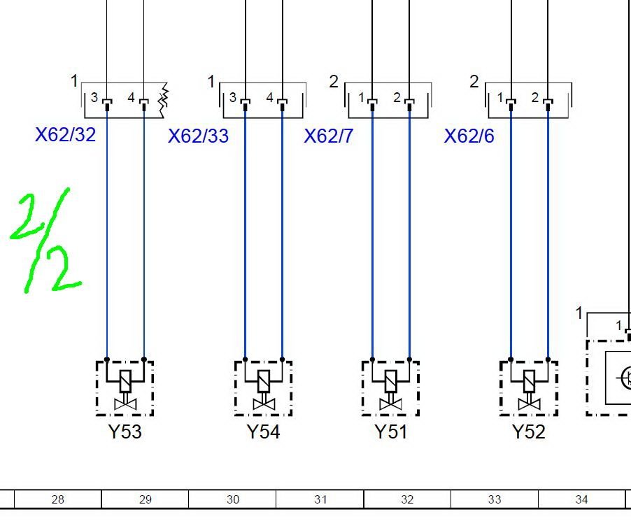 Ok... Either, there's just a plug at the shock (X62/7 in the diagrams), and then a plug at...? 3? Is that a black box with computers in it? Some arbitrarily convenient access point for the CANbus? (Pardon my ignorance, this is my first car of this recent a vintage that I've had to do more than basic maintenance on AND my first Mercedes.) Or is the notation here such that there is a plug at the shock (Y51), another at some interstitial point X62/7 (where/what is this exactly?), and then another at 3? It sorta makes sense that there might be an additional junction in there since the wire connecting to the shock is in a vulnerable location in the wheel well. Would help with serviceability to be able to replace a short and easily accessible pigtail rather than a whole harness if something got stuffed. Are there any diagrams in your software for the physical location (and maybe even appearance) of things?