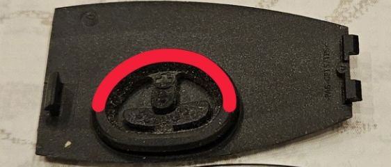 To fix this, I removed the cover, and with a sharp X-Acto knife, I shaved the rubber in the area indicated in red. I removed enough rubber material in this area that allows the thicker battery to fill that space... and flatten the cover to it's normal position when reinstalled. You can remove all of the rubber in this area if you want, or just remove a little at a time, then test.
