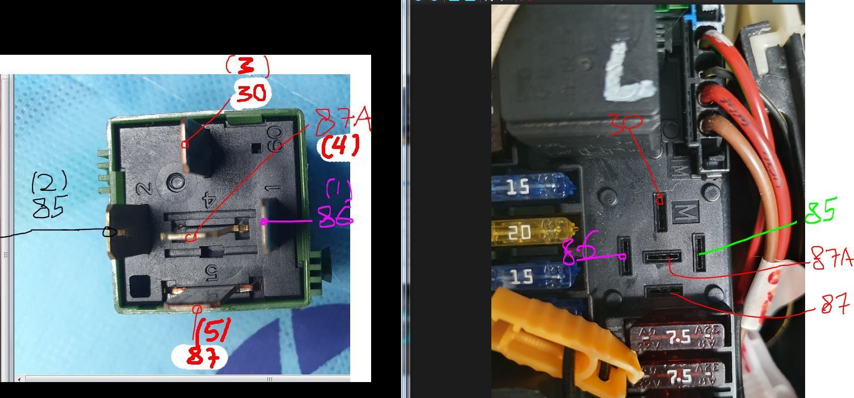 Yellow Fluke DMM is pin 85 of relay. Blue EEVBlog DMM is for pin 86 of relay.