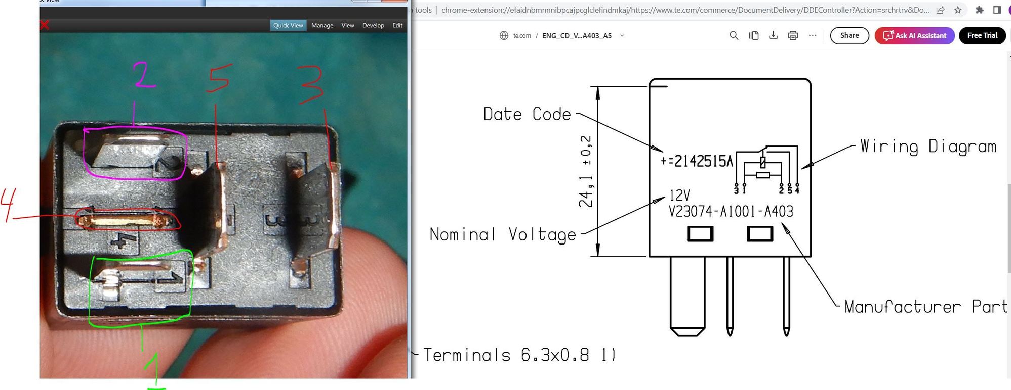 Good thing is the pin 1 is equal to pin 85 negative for coil is consistent for both relays actual physical wiring. I marked white dot for the 85-ground.