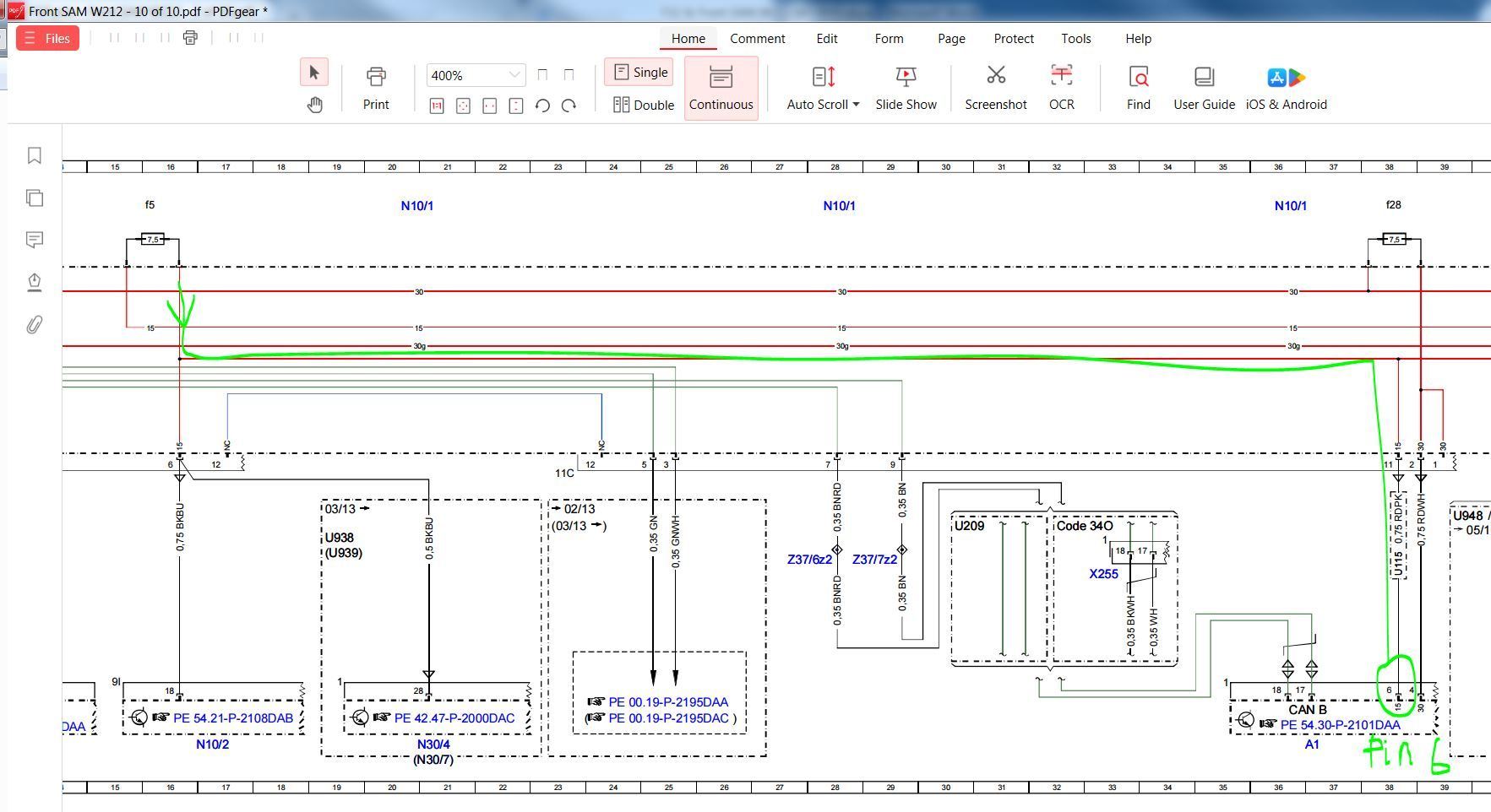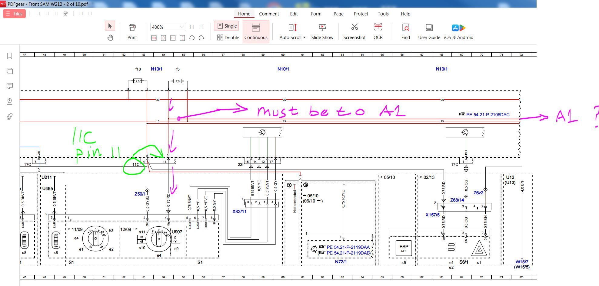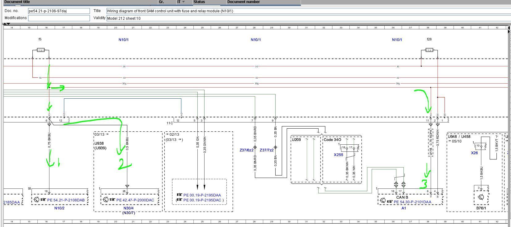 On my facelift car, I can confirm that the wiring of Fuse 5 at Front SAM sheet 2 and sheet 10 is correct for the number of wires and color of wires at :
