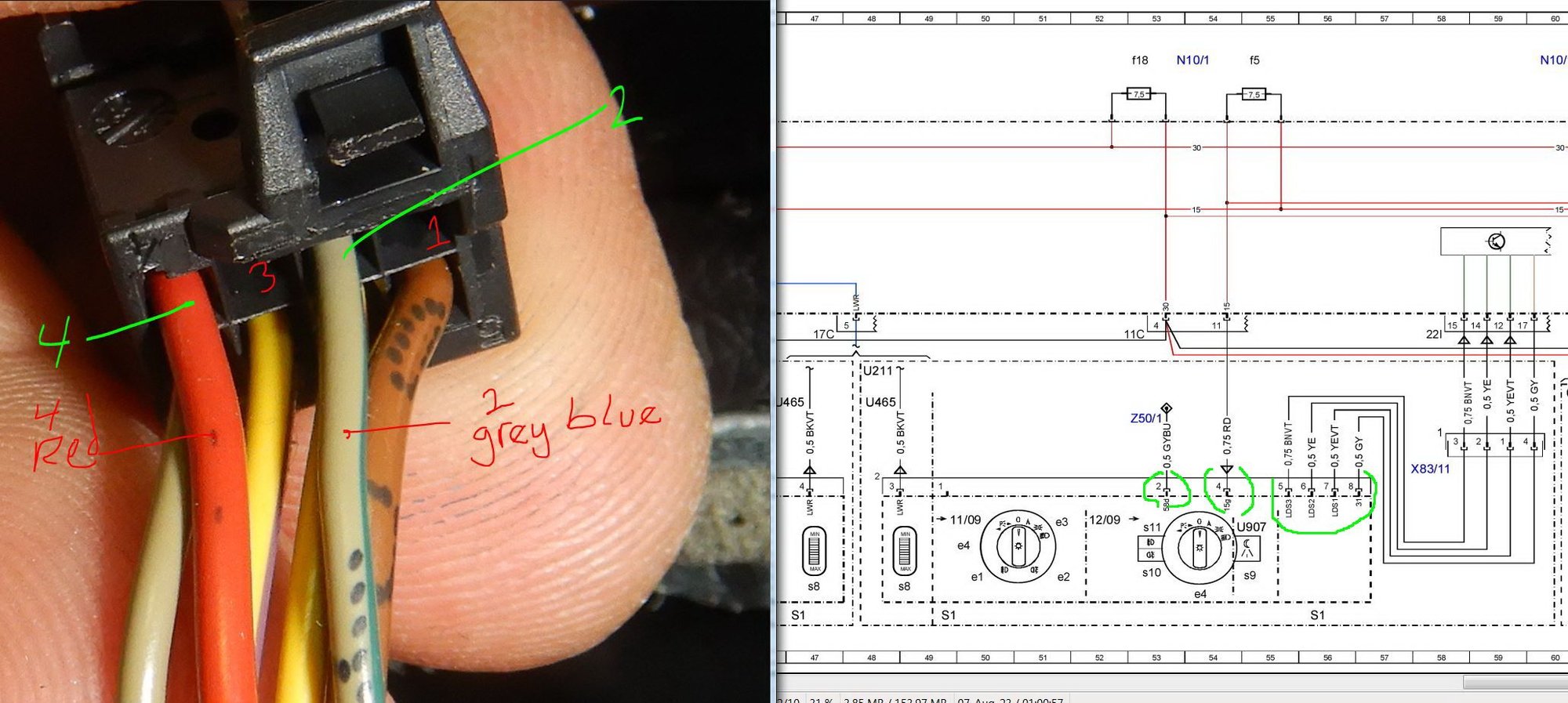 I can also confirm for the S1 rotary light switch, that indeed 0.75mm red wire is for S1 at connector 2 ( only 1 connector actually ) pin 4