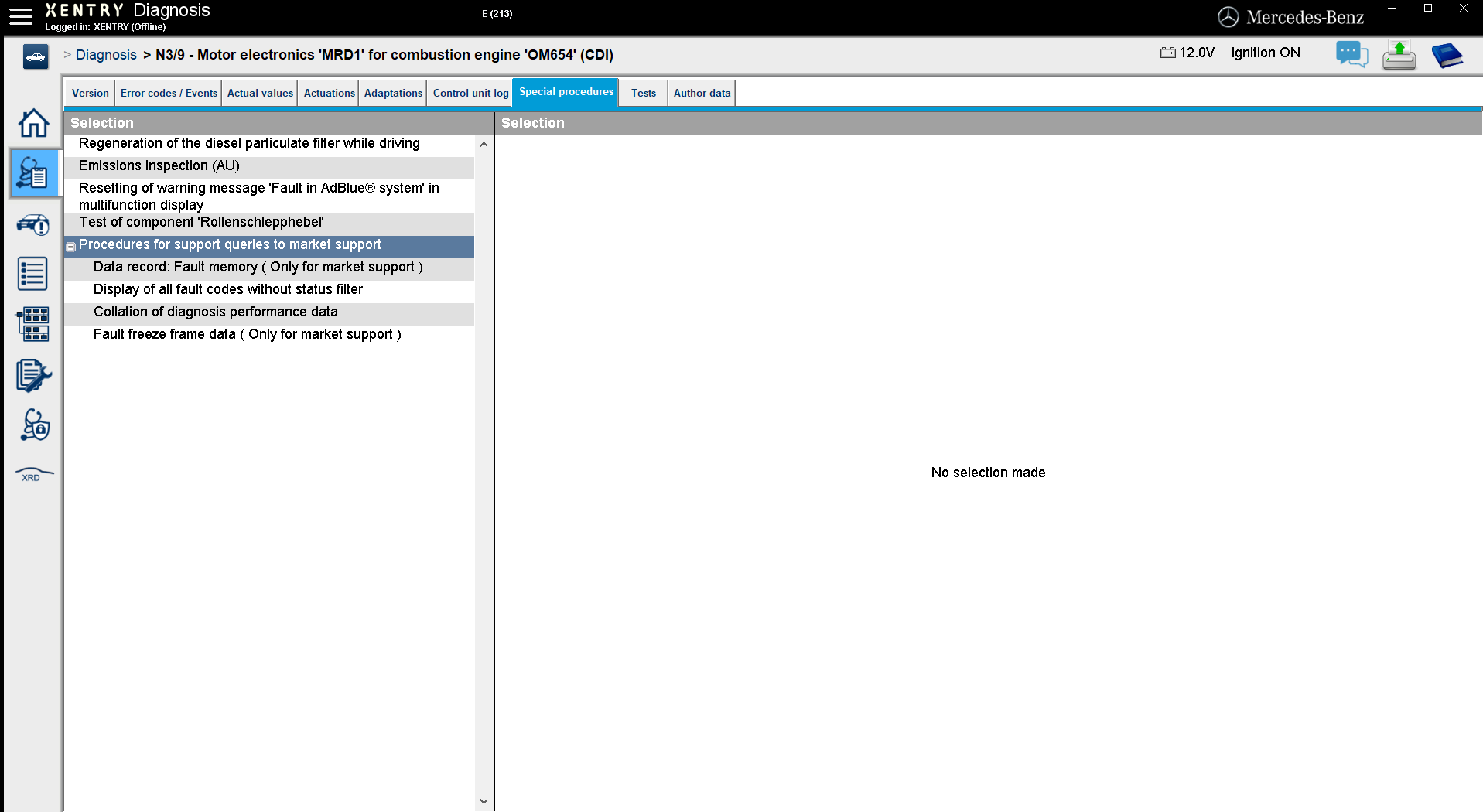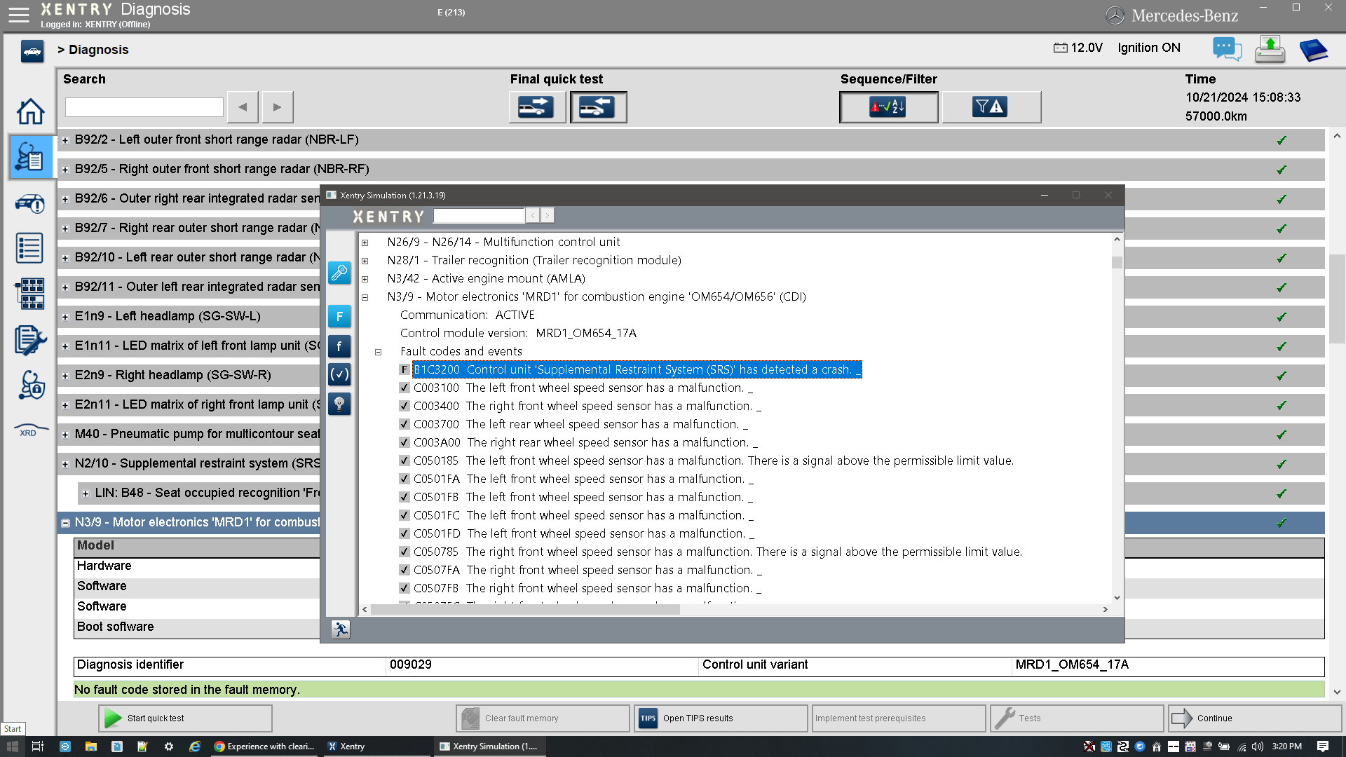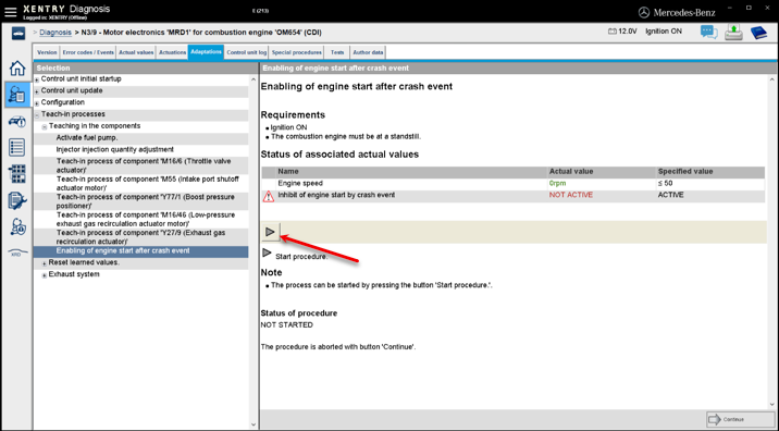 The screenshot is from Xentry, as I load N3/9 - Motor electronics 'MRD1', I get the prompt for "Enabling engine start after crash event" but it keeps failing... I'm suspecting it's not working because of the active errors in SRS (airbags/seatbelts).