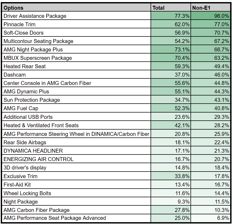 Soft Close and multicontour seats are also very popular, again it's more about luxury than sportiness for most people which makes sense. The fact that only 6.9% of the non E1 cars have the AMG sport buckets seats is extremely telling, it's literally the lowest uptake of any option offered on this car, those seats are just not comfortable nor make sense for almost anyone.