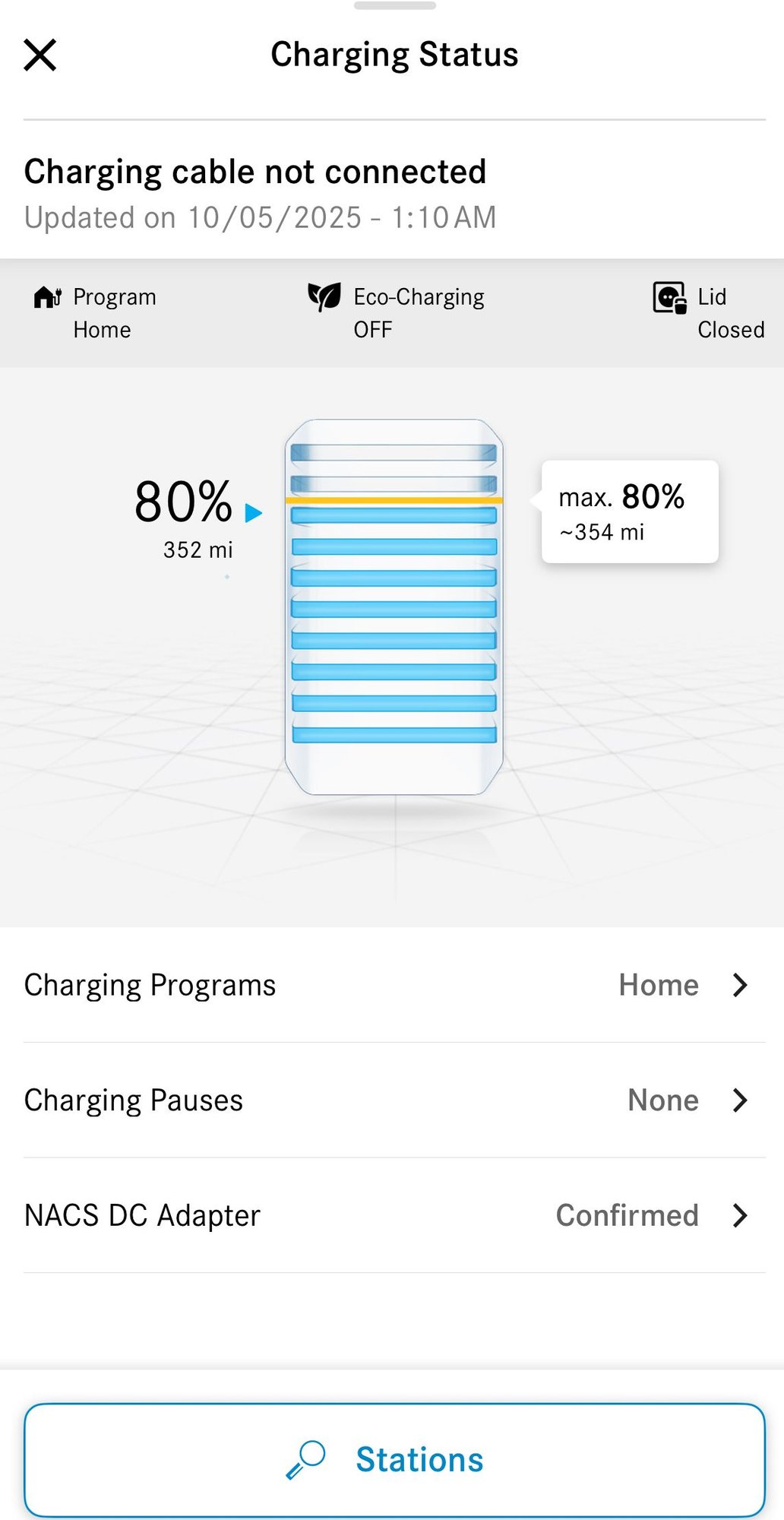 After charging to 80% after yesterday's 160 mile drive from Vail back down to our home in the foothills the below is the result of charging status and range prediction - 352 miles, 80% charge. This would be 1.25 x 352 = 440 miles for 100% charge. Conclusion: we were experiencing unusually high range efficiency coming from 10,000 feet down to 6,000, over 160 miles.