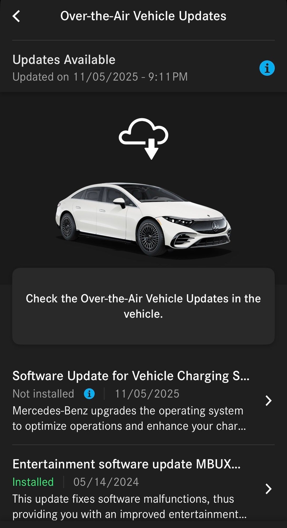So my MB app tells me that there is an update available. When I look on the car’s MBUX, it tells me nothing is available.