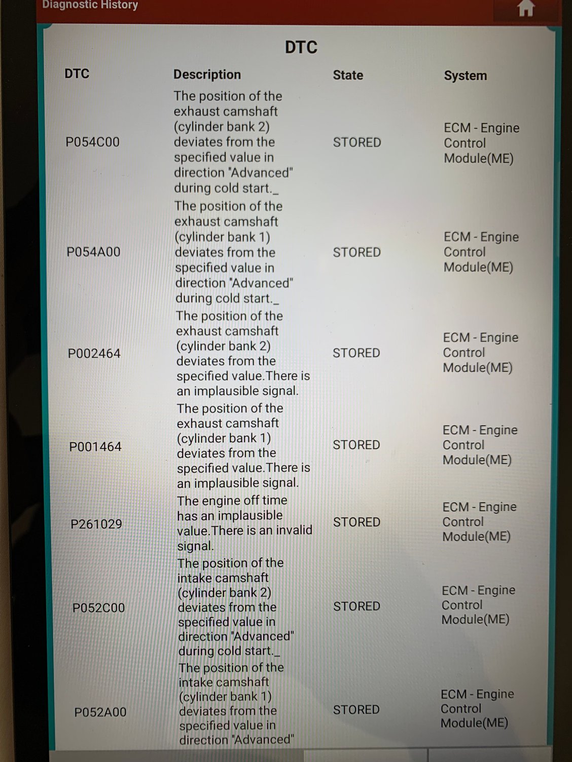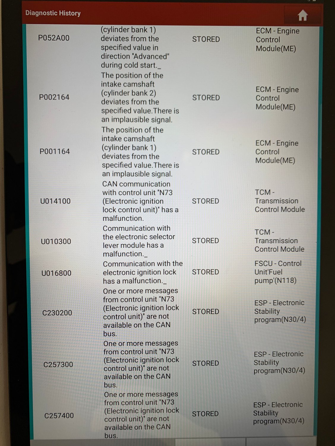 Ill ask her about the fuel when shes back. The nothing happens with the engine at all. I hear the fuel pump but nothing after. Ive done all the various servicing needed since the mechanics plan ran outl. Service C and D if i recall. These are the codes i just pulled.