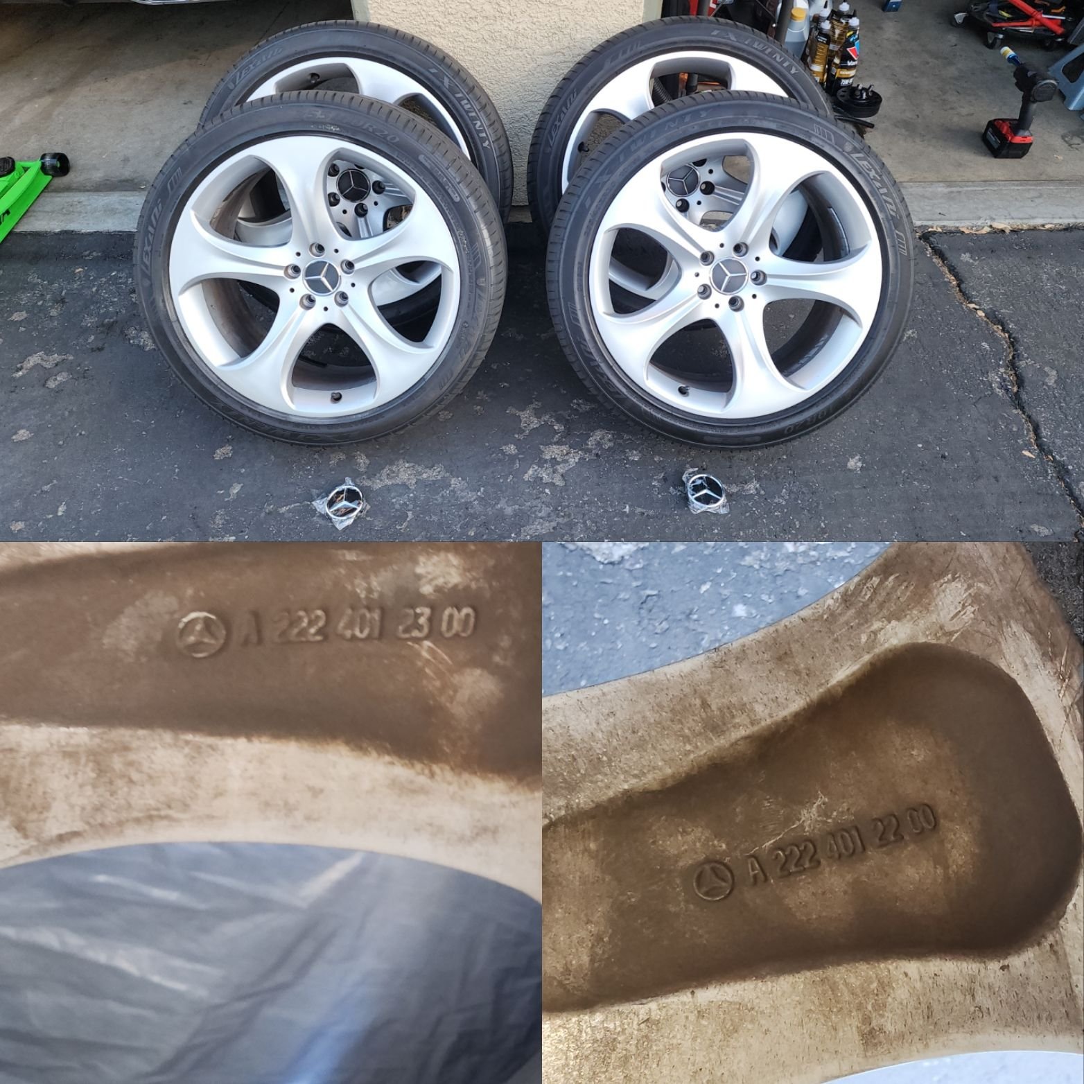 For sale, So Cal pickup only, 4 W222, S Class 20in staggered (8.5in front, 9.5in. rear) flair spoke rims, with tires and 6mo old tpms sensors & 2 spare center caps. NO BENDS, LEAKS or major scratching. Nothing wrong with them, just going with the stock AMG 5 spoke rims, and need the garage space. Factory takeoffs $700 thanks for looking.