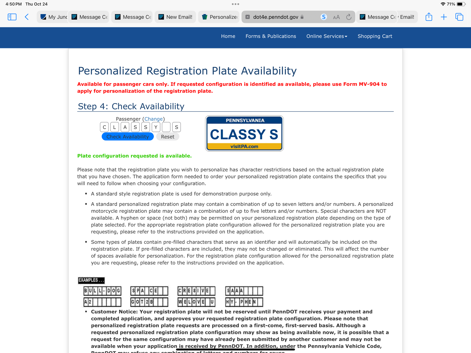 Some great ideas! PA accepts only 8 characters and a space is counted. ‘Classy S” is available. “MRMSCHF” works but will it be read for what it means?