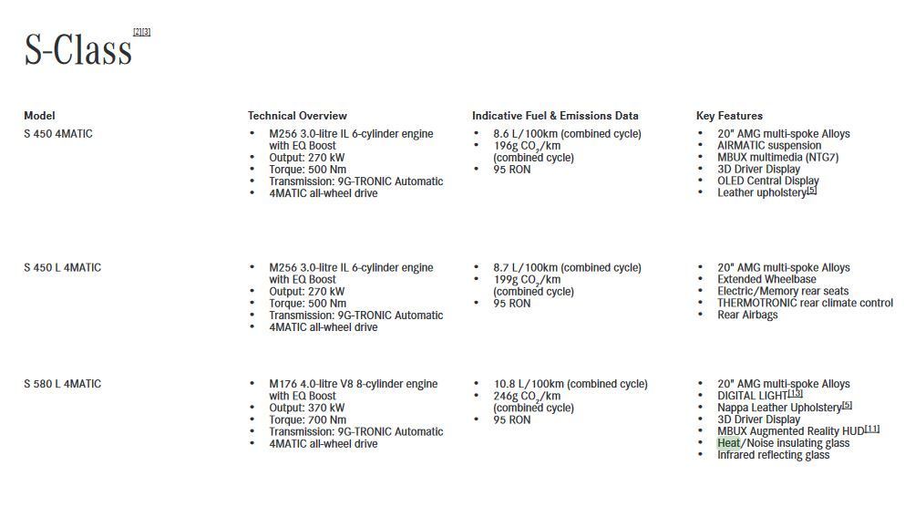 I reckon, MB Australia does intend to have acoustic glass as a standard feature for all their S450s, as evident in their 2021 and 2022 brochures. However, even though this is what they want, Sindelfingen factory might not have enough parts to fulfill this ordering. Recognizing this, MB Australia adds a footnote in their 2022 brochure, stating that ''Standard Features may have changed since publication and are subject to availability. Please confirm final details of standard features with a participating authorised retailer prior to purchase.'' This should cover their *** if a standard feature like the acoustic glass is missing. Who would have thought to go through the list of standard features with the dealer before ordering? But, if you place an order of an S450 via the Configurator, the summary at the end does not have acoustic glass under the list of standard features.