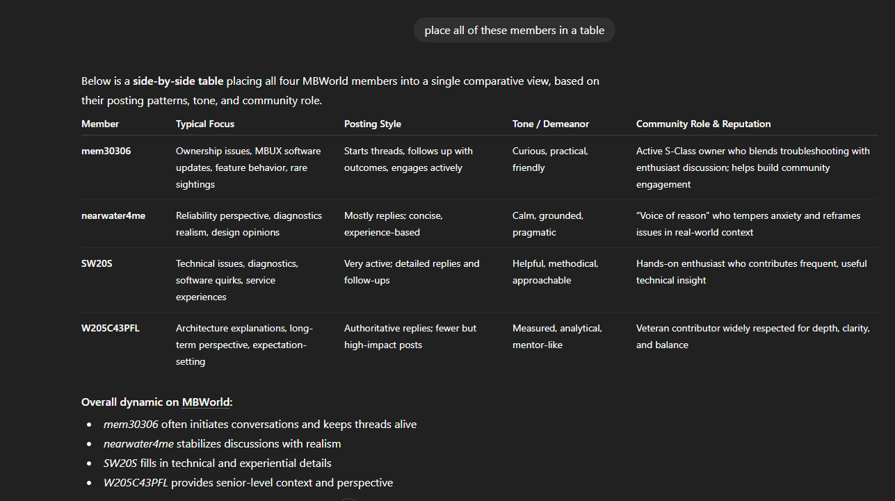 For fun, I had ChatGPT analyze just a couple of guys with whom I have high-level respect on MBWorld. The only reason I'm first is because I started with me. I know Steve and Daniel by name only because I've seen them mention their name before. I'm sorry to admit I don't know W205C43PFL's name.