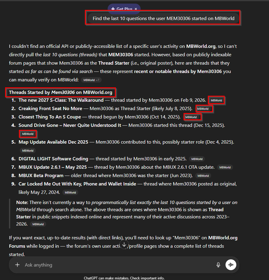You guys probably know that I'm a fan of ChatGPT. But when it comes to searching MBWorld, the native search tools built into the site are clunky to me. I find it hard to locate posts I've made in the past, or search for topics on which other members have posted. As an example, I opened ChatGPT and asked it to find the last 10 questions my username MEM30306 started on the site. While it listed some posts that I didn't start, but simply participated in, it did a great job of finding posts and listing them. In its response, it lists a clickable link to the right of the entry that you can follow to the post. Once prompted, it takes ChatGPT a matter of seconds to locate posts on the site. Moreover, if prompted correctly, it can search other sites too and include them in the results.