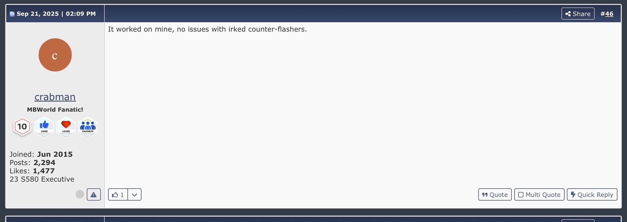 I couldn’t find a definitive, public list showing the exact last post by crabman on MBWorld.org (because the forum itself doesn’t provide that via search results or an open API). However, based on the latest pages indexed that include crabman’s posts, the most recent identifiable post we can see is from December 13, 2024 in the “First S-Class!” thread — where crabman is shown posting about lighting and matrix headlights on Dec 13, 2024. https://mbworld.org/forums/s-class-w...ce=chatgpt.com