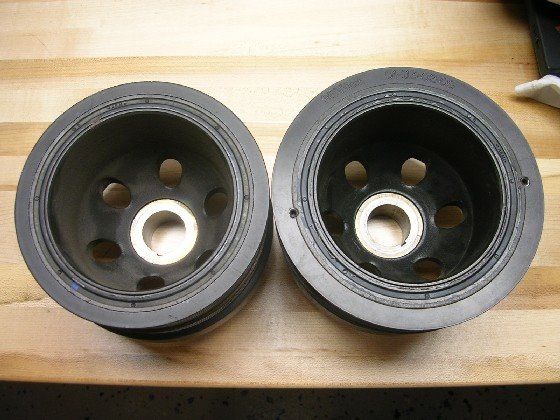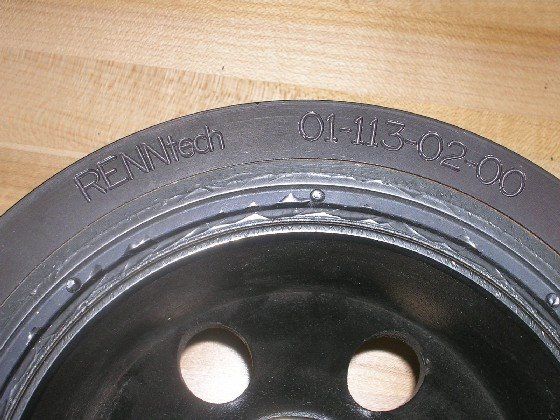 Remove center bolt and crank pulley. Stock one on the left, Renntech on the right.