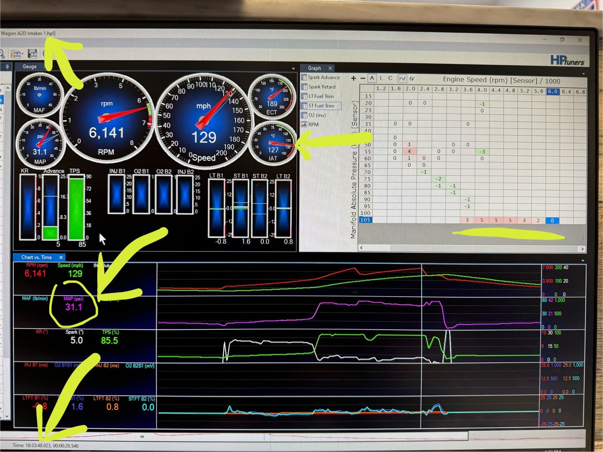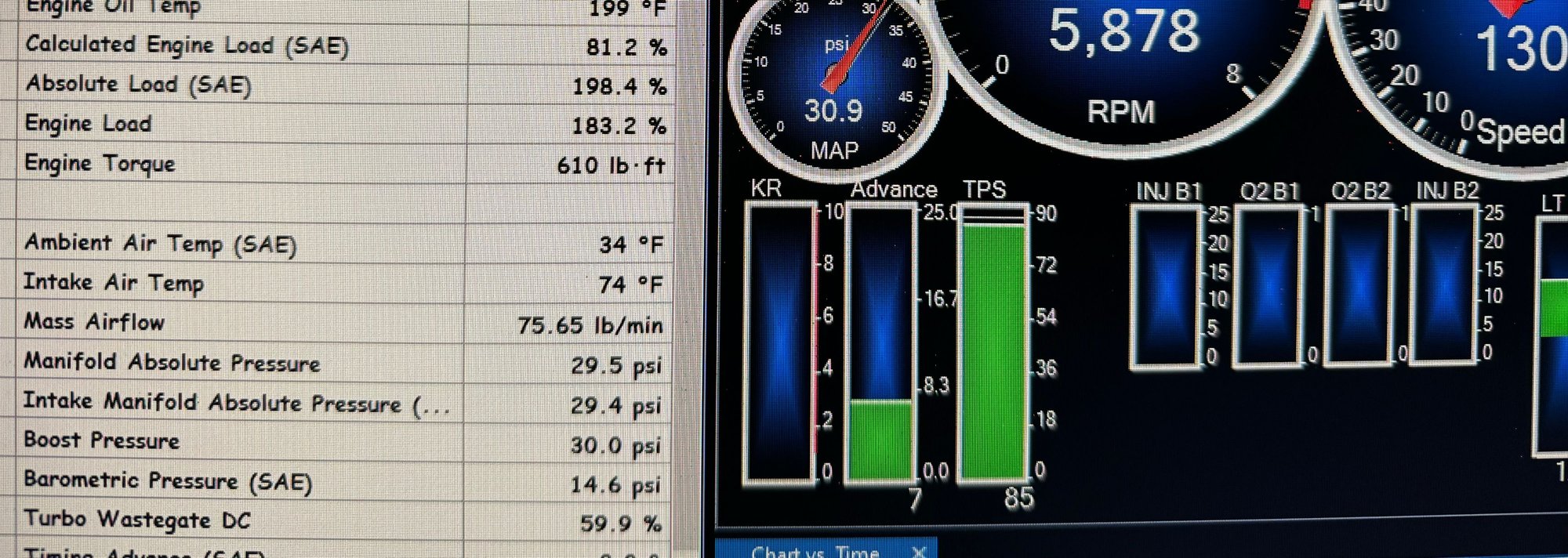First thing we found was with the HIGH FLOW intakes, we were able to get intake temps lower prior to starting points . The higher flow allows the turbos to breathe much easier which results in better temps even while Cruising, so we needed to hit it a little just to get temps up in order to start off in the same area as the stock intakes for accuracy in the log comparisons.
