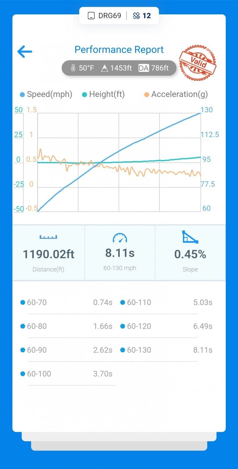 New PB from 60 to 130. 7.90 > 8.11. Believe this time is hampered by 91 octane fuel. I do have 5 gallons of 91 in the car right now, and I added 4 gallons of Sunoco 100 octane fuel. I will go out soon and rerun all of these tests to see if the car will pick up with the increase of octane like it seems the 93 octane cars do.