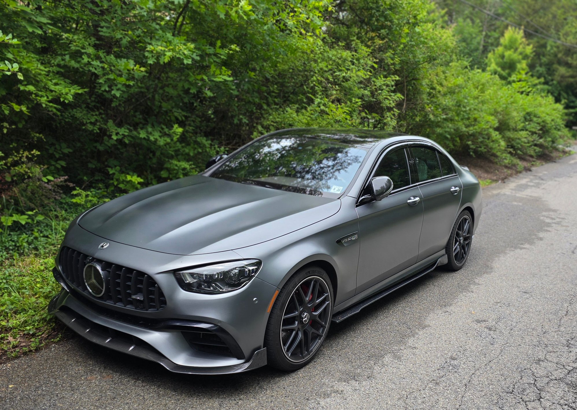 I think the facelifted w213 E63 looked pretty good when I first got it, but over time, I got that itch to make it look my own. I always hoped MB would create an E63 Black Series, until they do, I wanted to see if I could make the car look more aggressive and wider. Keeping in mind this was still a sedan at the end of the day, I didn't want to go too crazy. Recently added a front lip, side skirt extensions, and rear diffuser. Its actually quite difficult to find aftermarket parts for the facelifted E63, there seems to be plenty for the pre-facelift. Lots of time spent figuring out the right look and compromising. Fun fact, the rear diffuser is supposed to only fit a pre-facelift however, took a gamble and the cut outs just barely fit the new exhaust tips. I had the window rain guards from before which I think give the car more aggression from up top. I wish MB gave the E63 flared rear fenders as well. I debated doing something to this effect as well but realized its probably not worth it. This is most likely as far as I will take it modifying the exterior. Maybe making it sound louder to match the aggression is in my future.