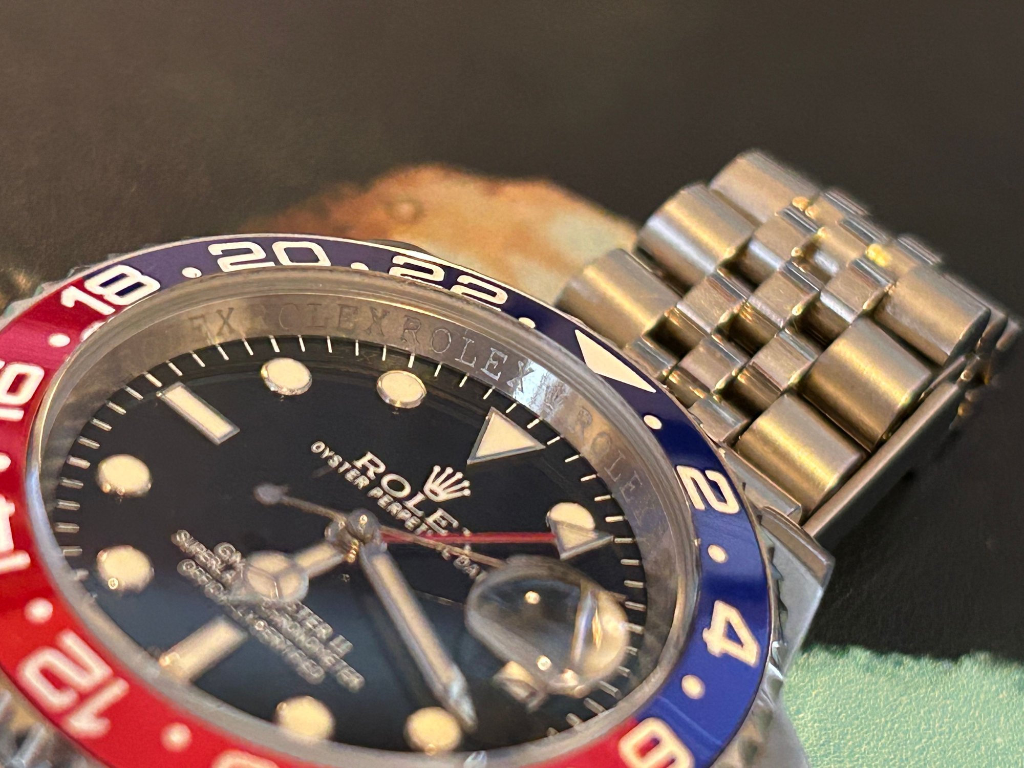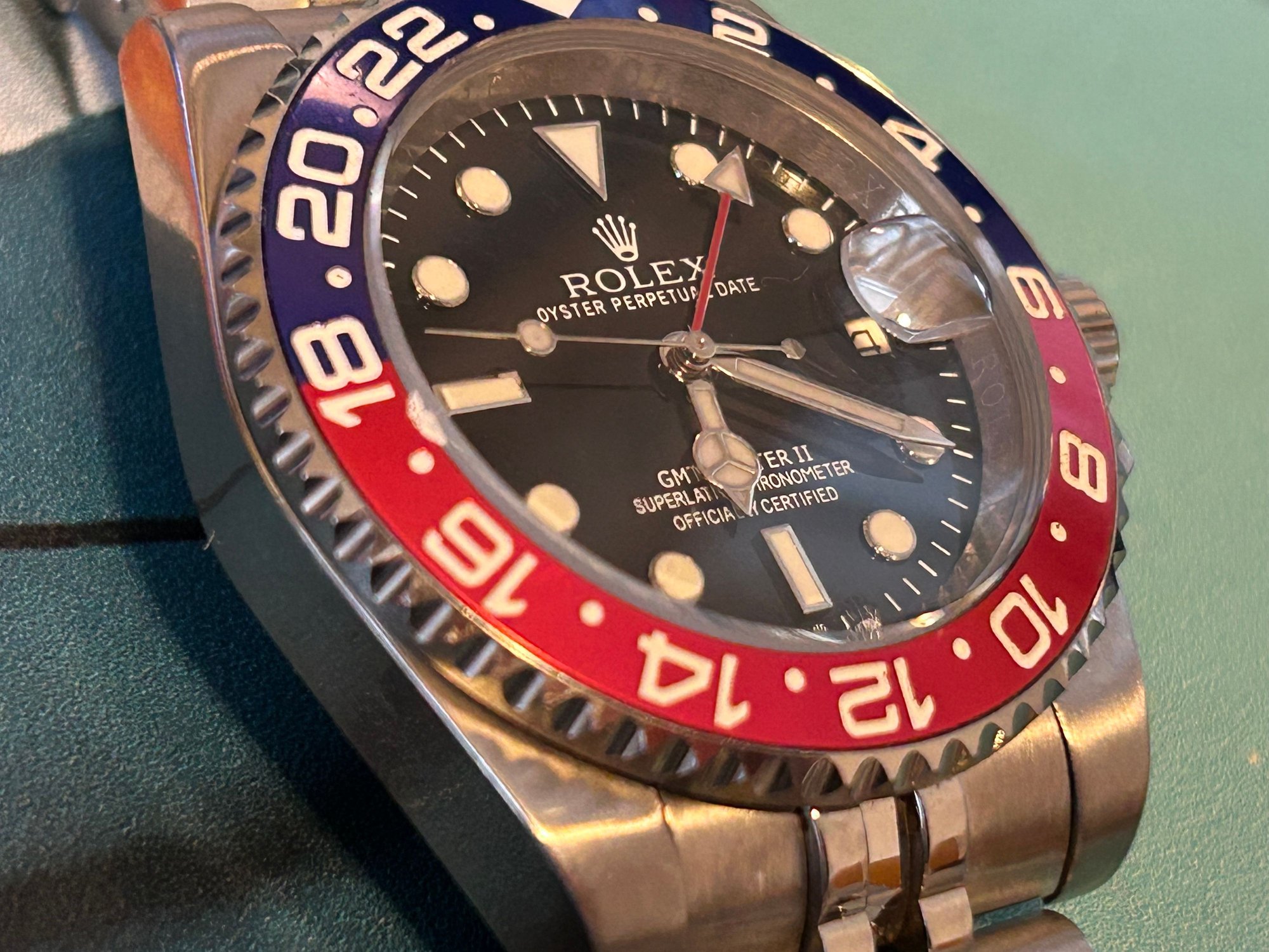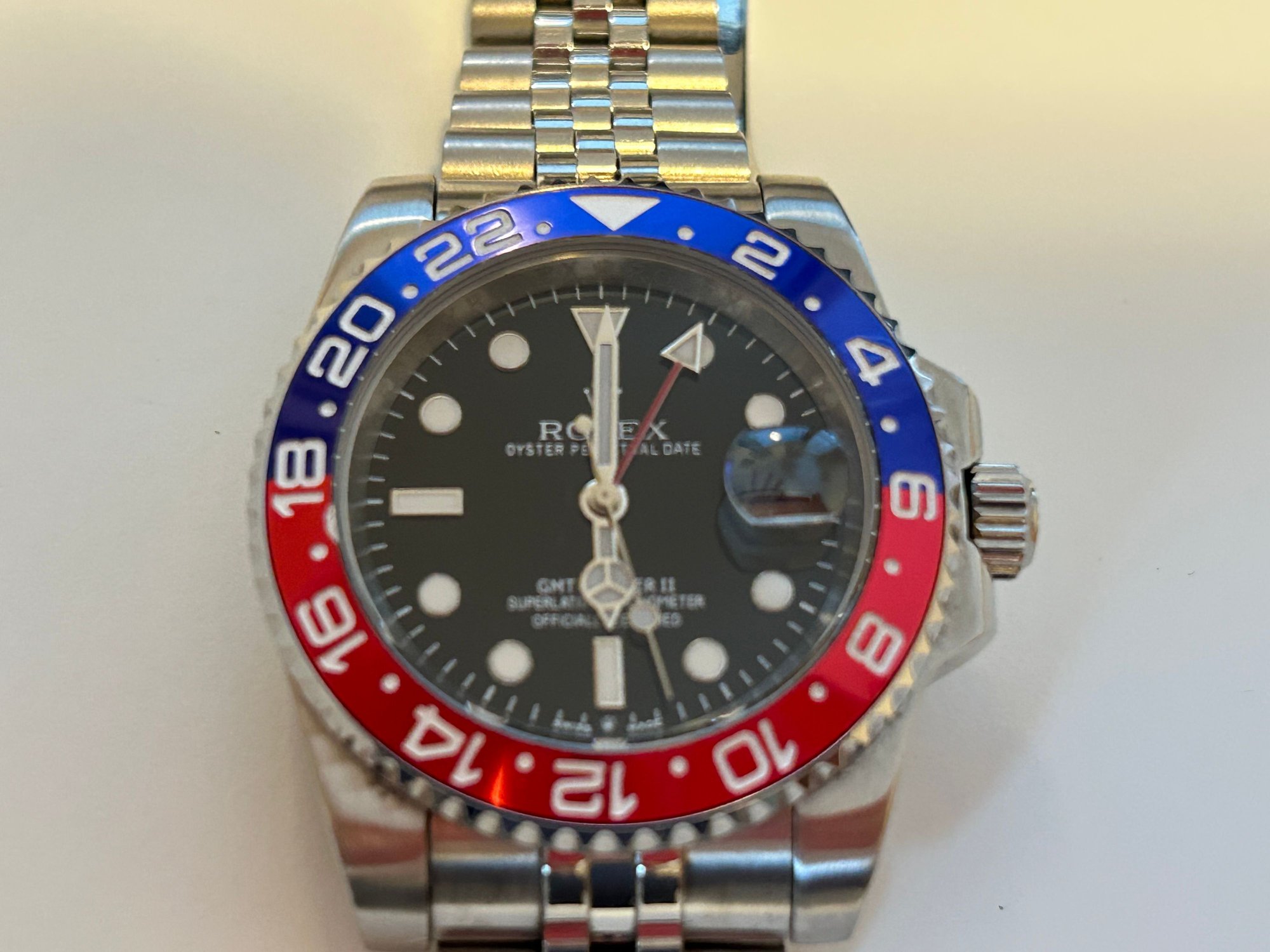 I know there’s not a lot of respect for replica watches here but here goes: Mid-level replica Rolex GMT Master II “Pepsi”, keeps excellent time with great power reserve. GMT hand functions like genuine. Excellent used condition. Sized to 7-1/4” wrist with 4 extra links.