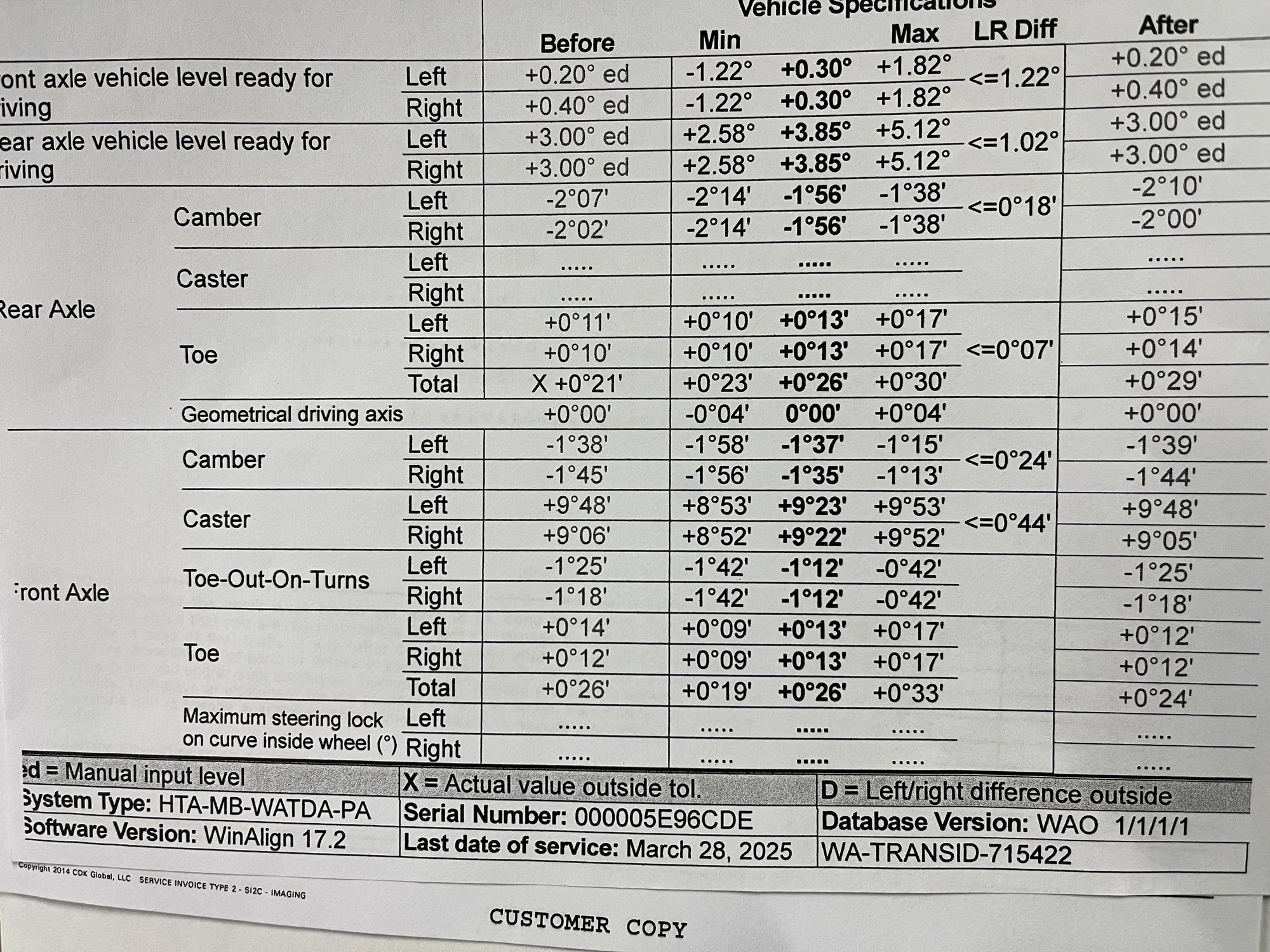 Wheel alignment specs at 17600 miles.