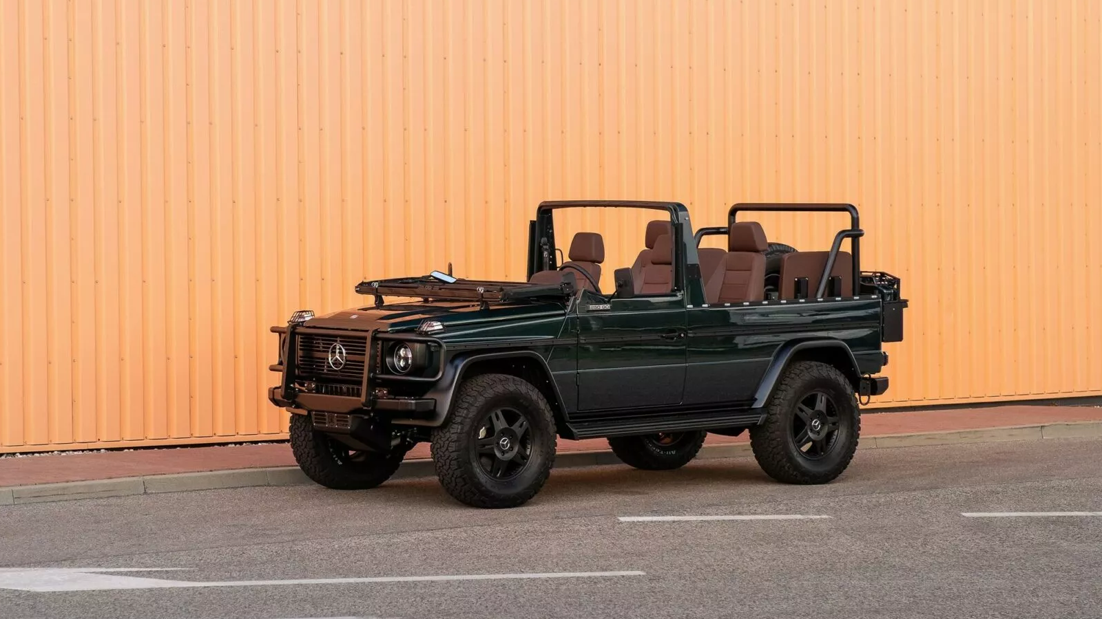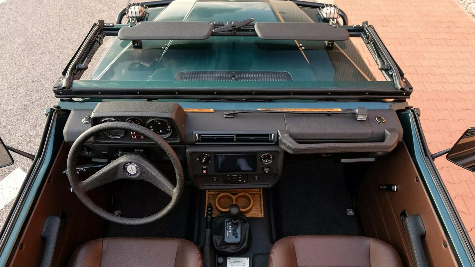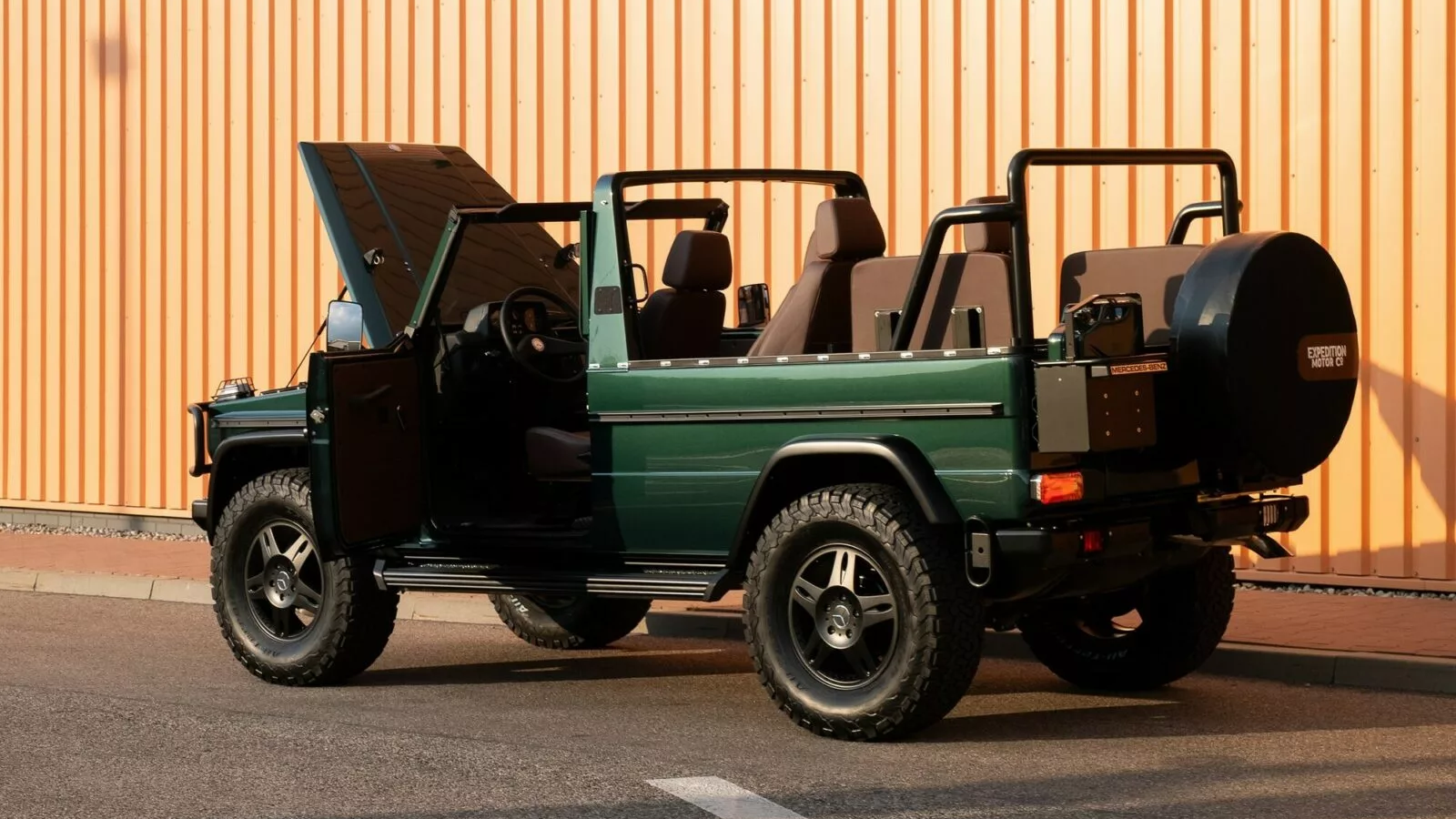 Aesthetically, EMC’s stretched G-Class balances authenticity with subtle modernization. The exterior can be finished in virtually any color and paired with custom bumpers, wheels, and LED lighting. One showcased example wears dark green paint, black bull bars, and 18-inch wheels. Inside, brown leather bucket seats and a fold-down windshield complete the convertible experience.