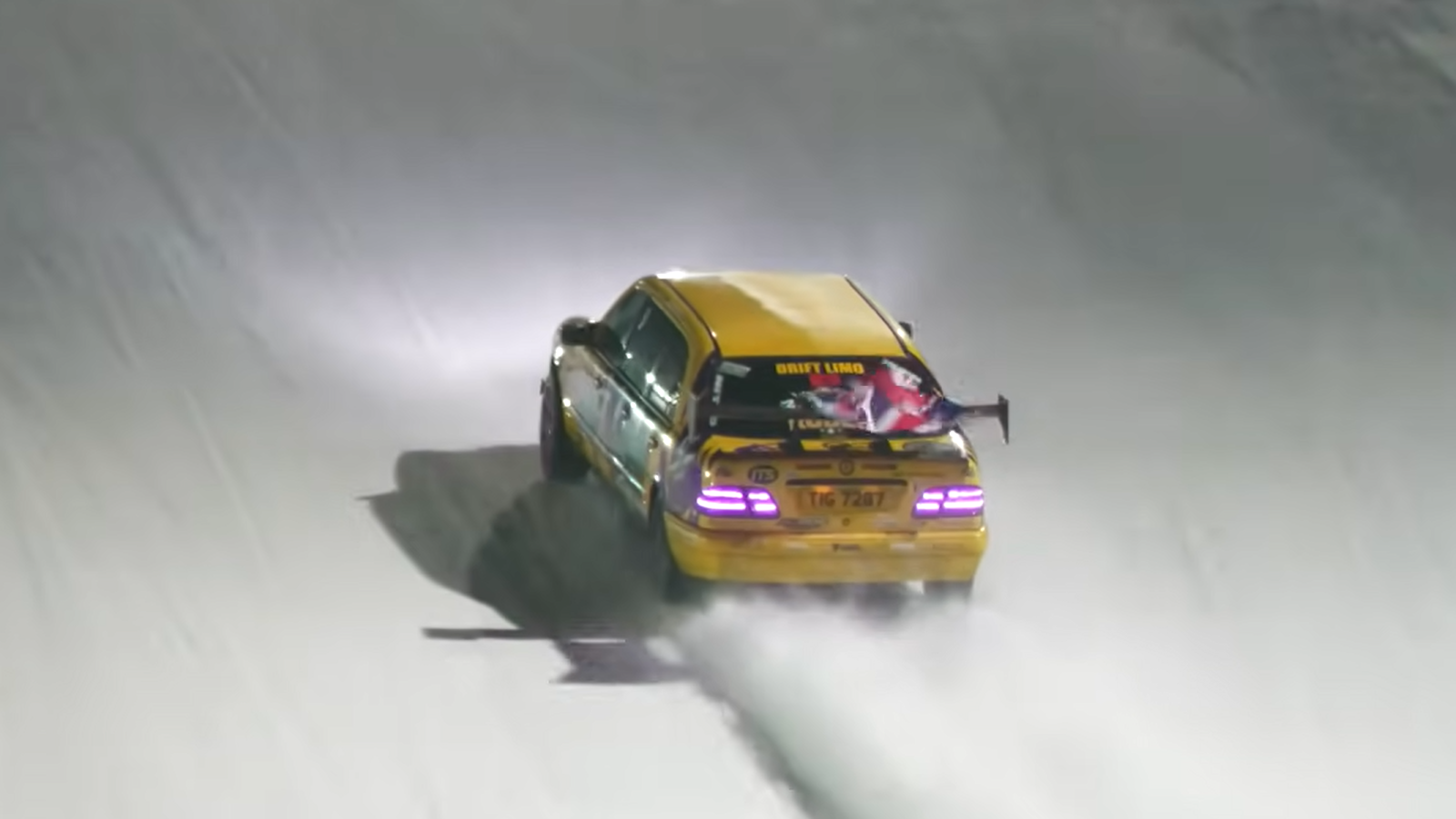 The exterior reinforces the car’s wild purpose. Bright yellow paint, large “Drift Limo” graphics, and an oversized rear wing give the stretched sedan a race-car aesthetic that contrasts sharply with its limousine origins. While the wing theoretically helps with stability, much of the car’s character comes from its sheer absurdity, a luxury limo transformed into a drifting performance build.