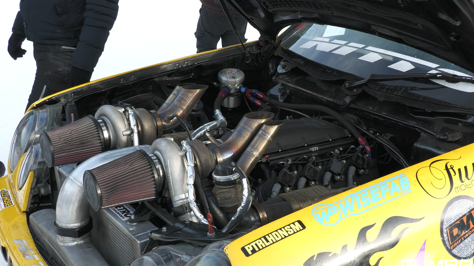 The most eye-catching part of the build is the pair of enormous turbochargers mounted high enough to protrude through the hood. According to the builder, the units are so large they are “bigger than your face,” and their placement makes them impossible to ignore. Exhaust outlets also exit through the hood, occasionally producing flames under load, which adds to the car’s theatrical appearance when it’s pushed hard.