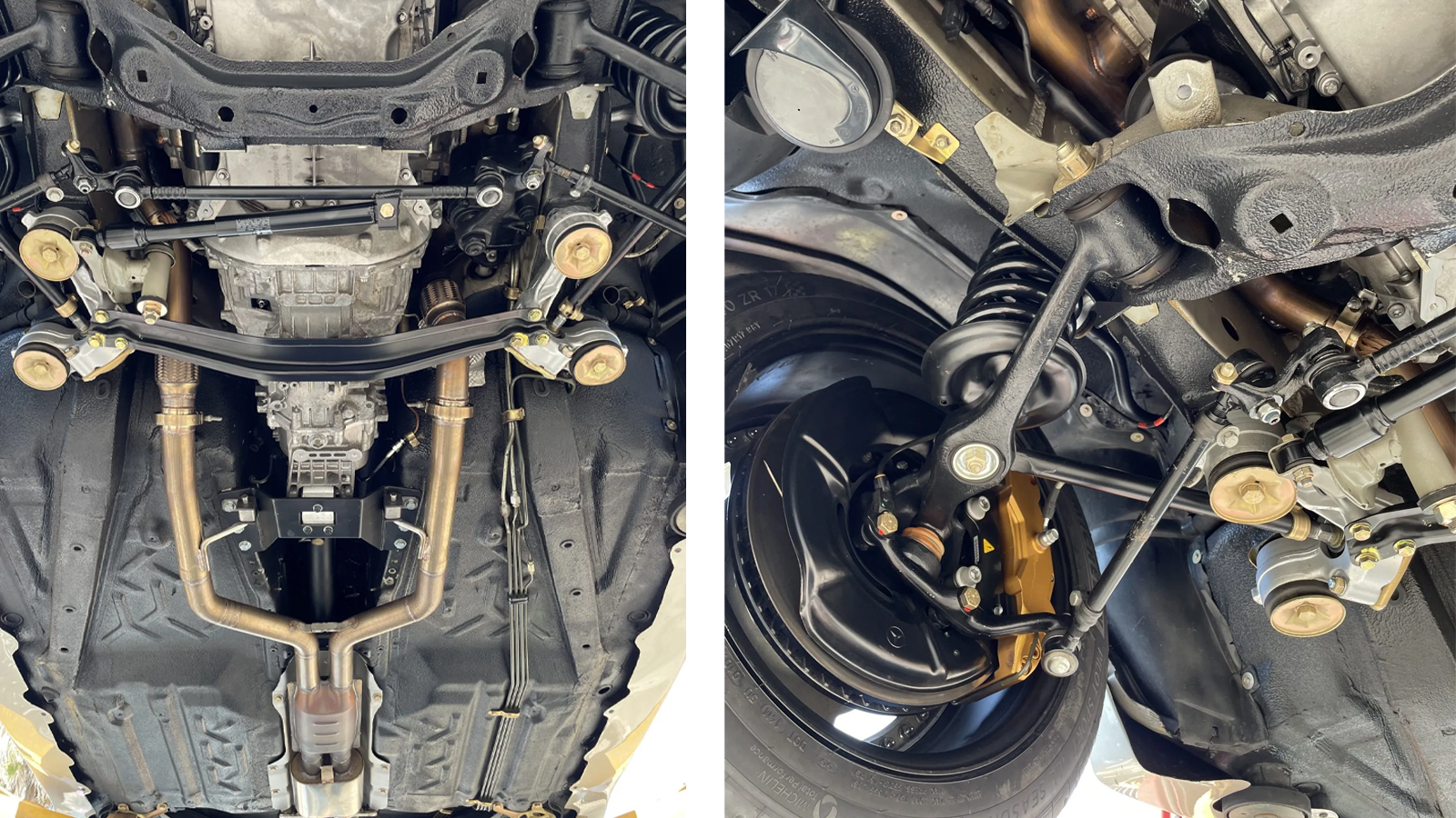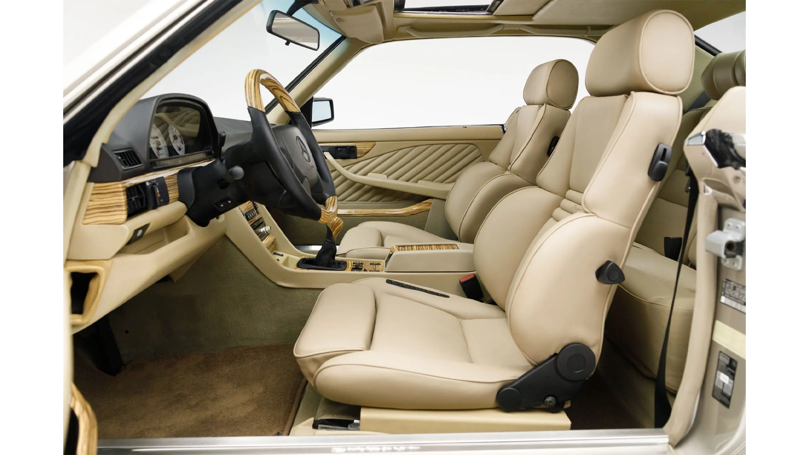 Under the hood, this 560SEC is powered by an M156 6.2-liter naturally aspirated V8 engine sourced from a newer AMG model, showcasing a significant upgrade over its original engine. Paired with a six-speed manual transmission and a limited-slip differential, this Mercedes offers a hands-on driving experience that merges classic handling with modern power. A custom stainless steel exhaust further enhances the car’s auditory presence, providing the throaty rumble of a performance V8.